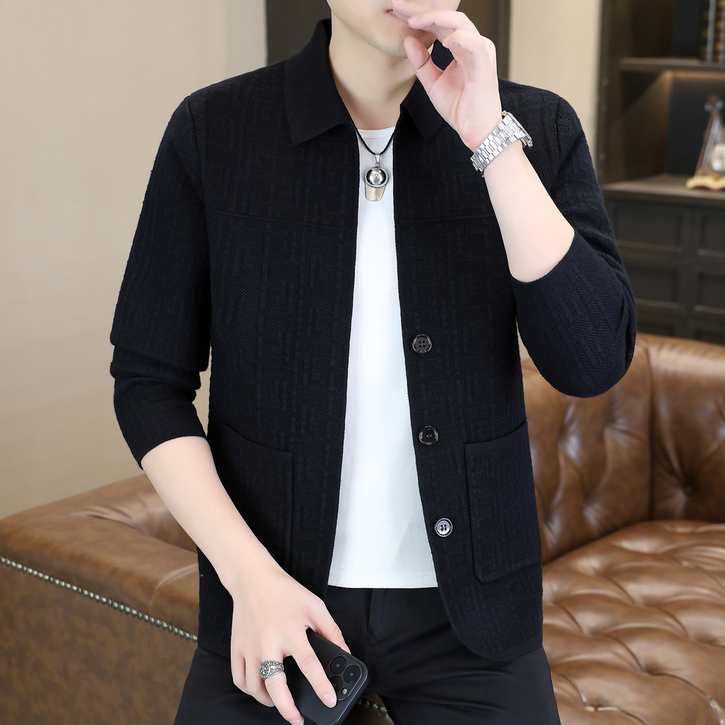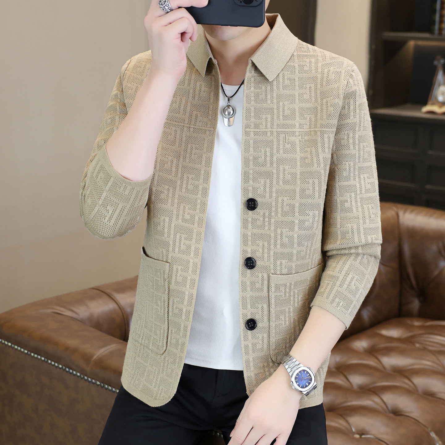 春秋季时尚潮牌格子开衫毛衣男士高品质翻领韩版刺绣针织风衣外套