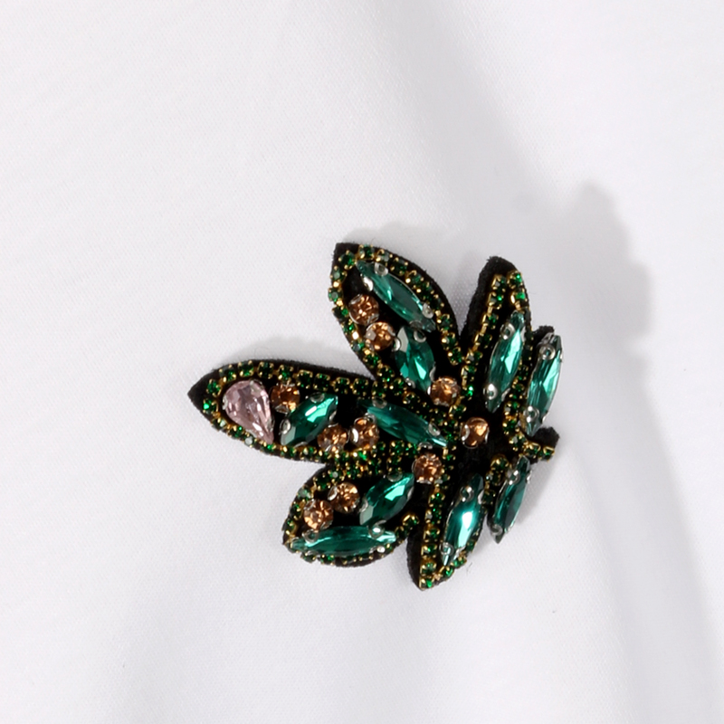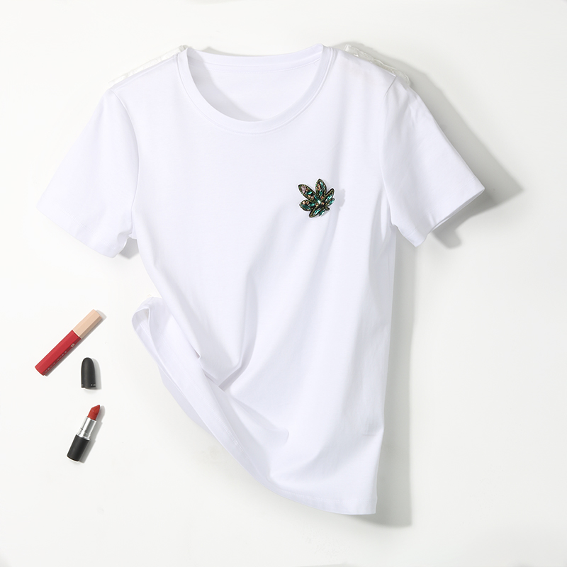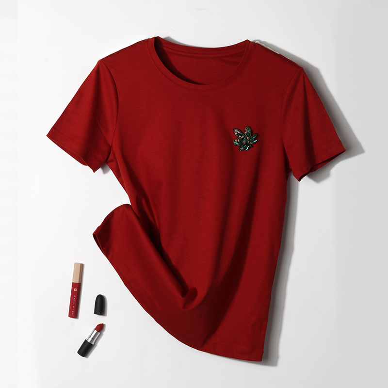 欧洲站夏款丝光棉短袖真丝宽松水钻树叶手工刺绣桑蚕丝T恤女冰凉