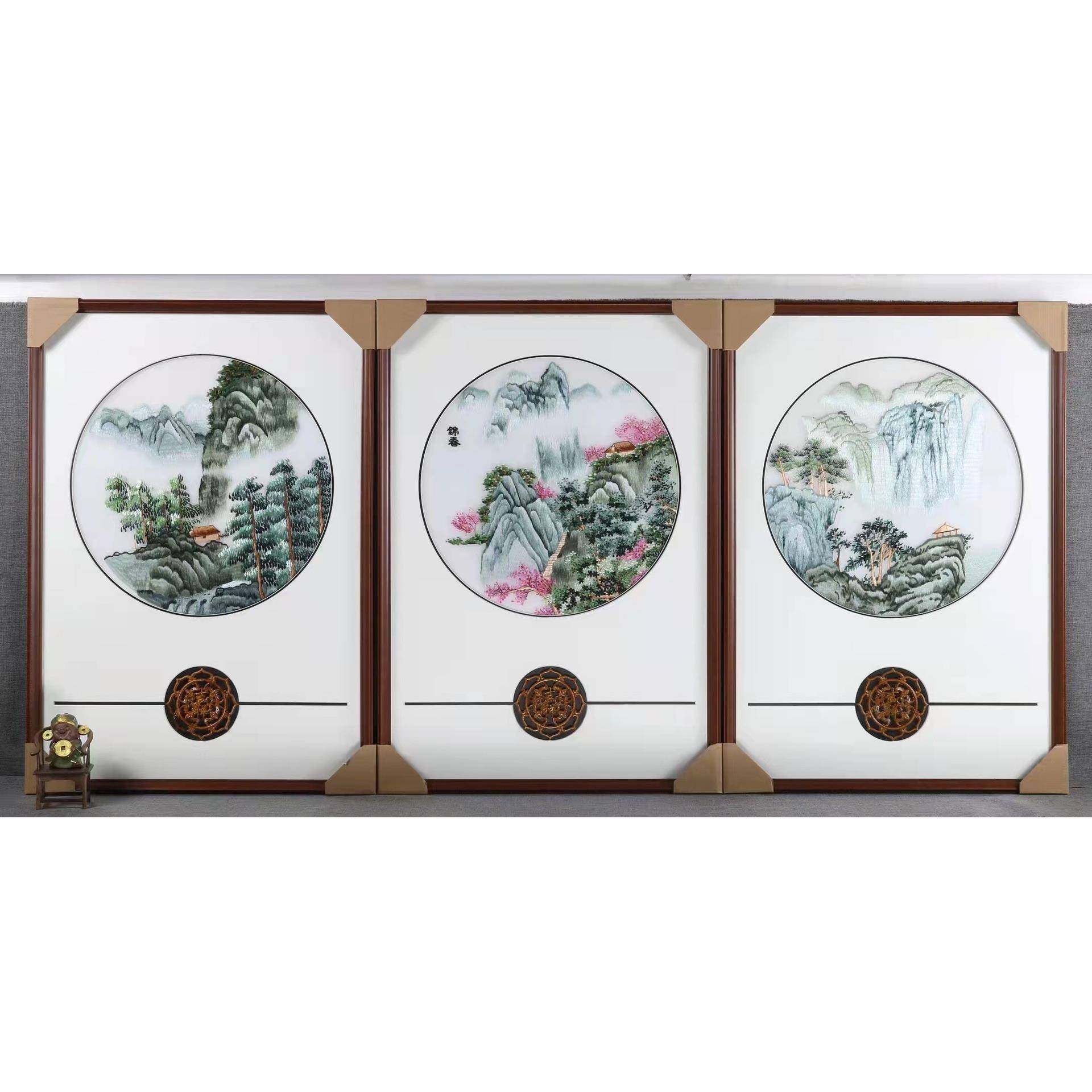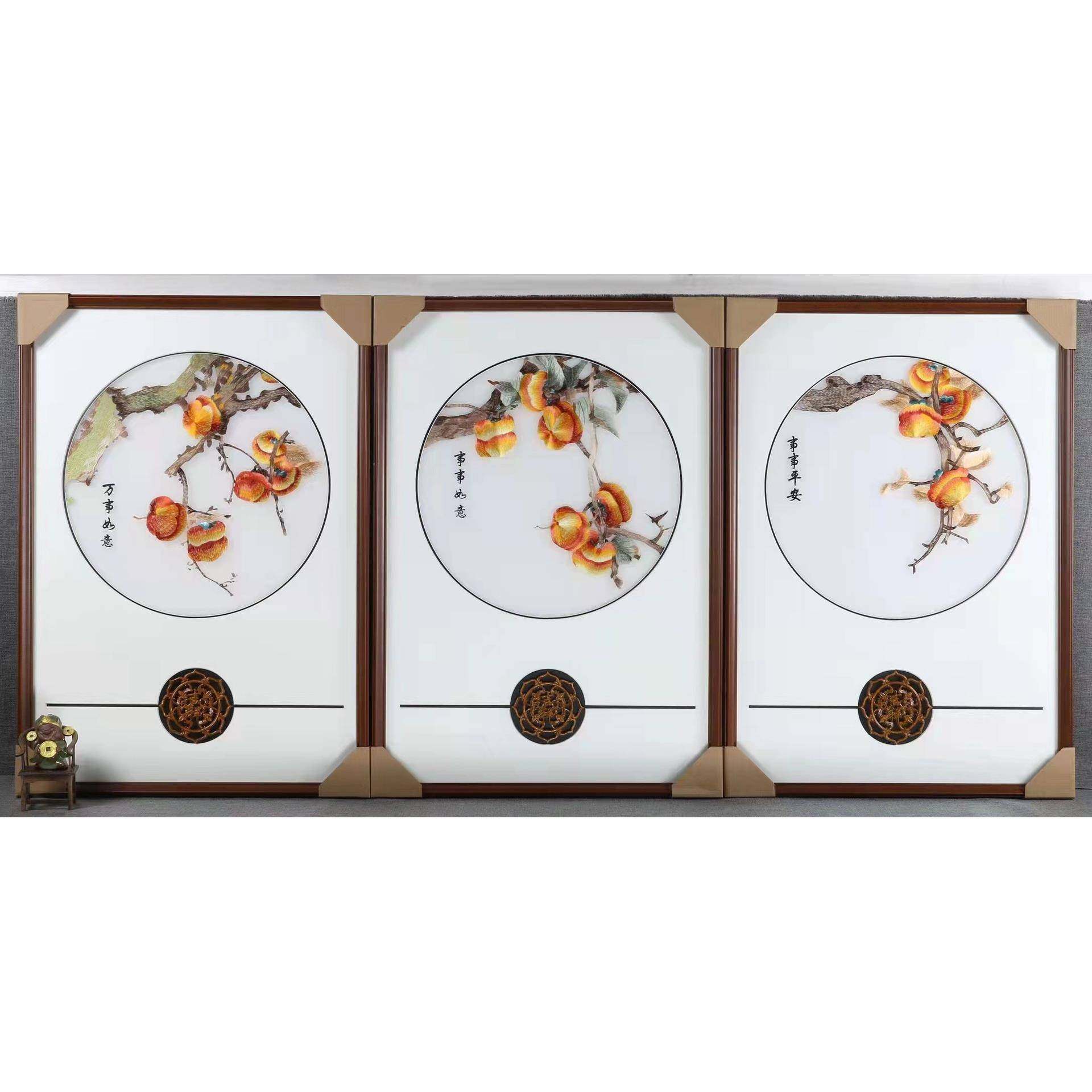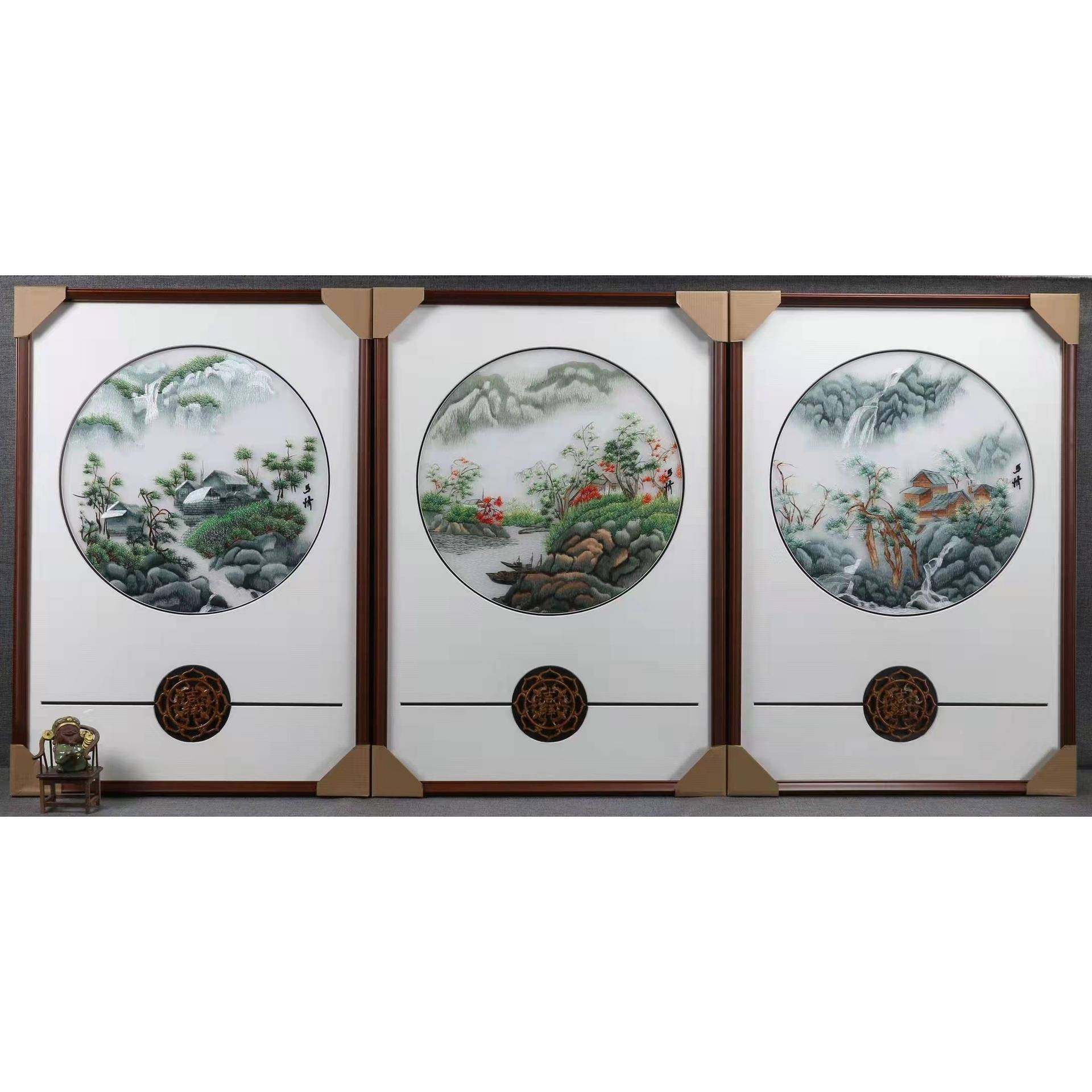 苏绣式成品挂画透DDD明苏丝娟装刺绣新中客厅三联带樟木绣饰画