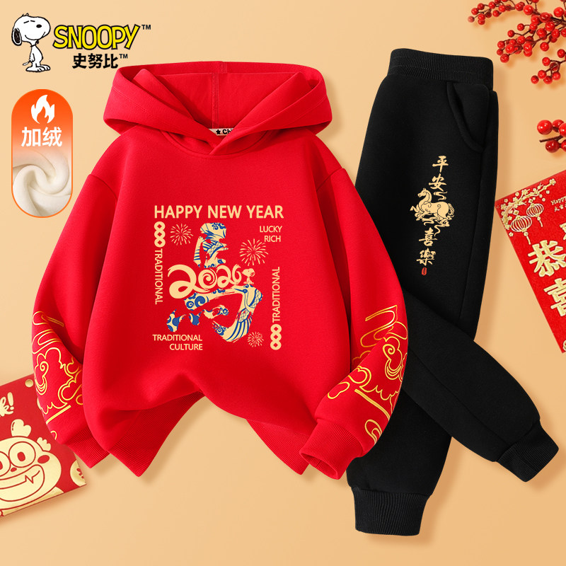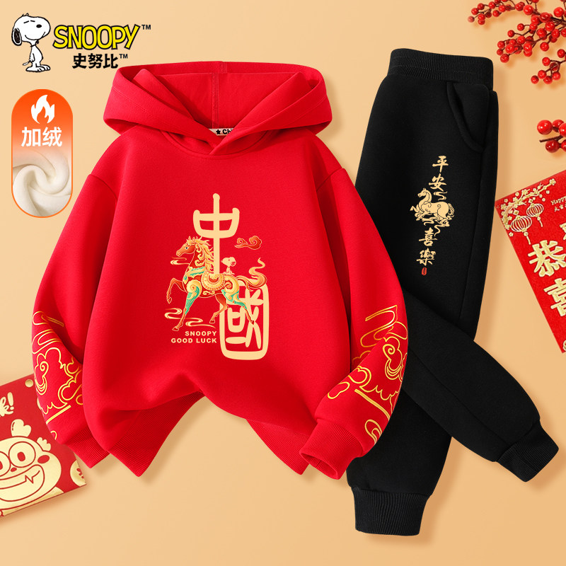 史努比男童冬装套装2026马年本命年衣服红色加绒卫衣儿童拜年服厚