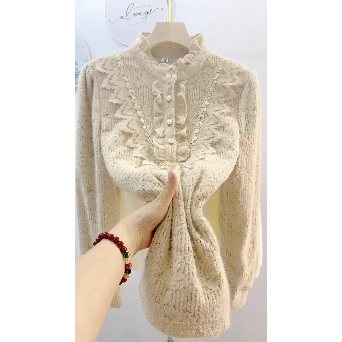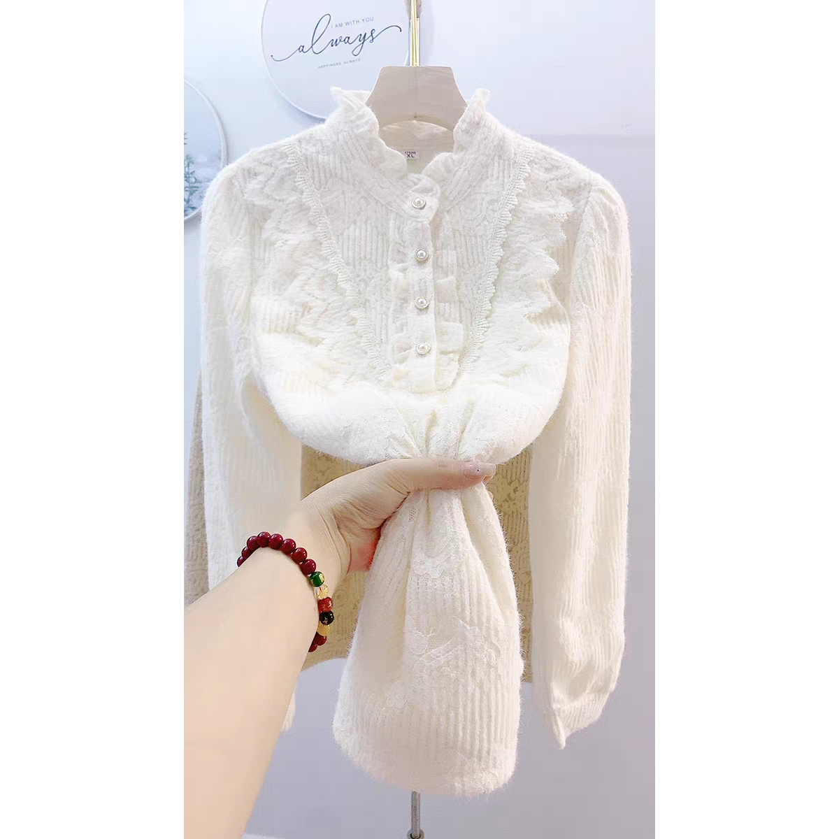 冬立领木耳边加绒蕾丝打底衫女宽松显瘦小香风上衣加厚衬衫小衫