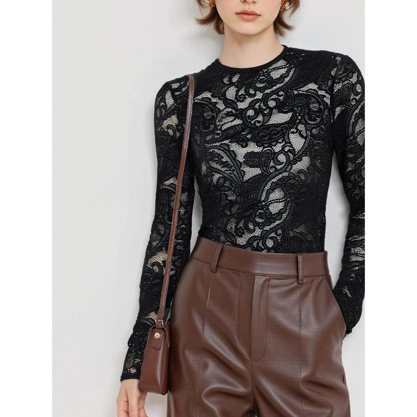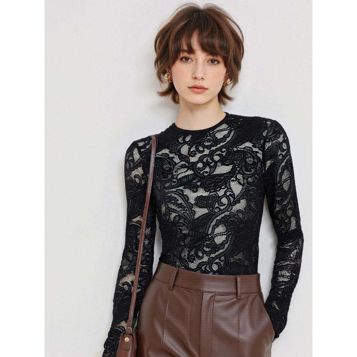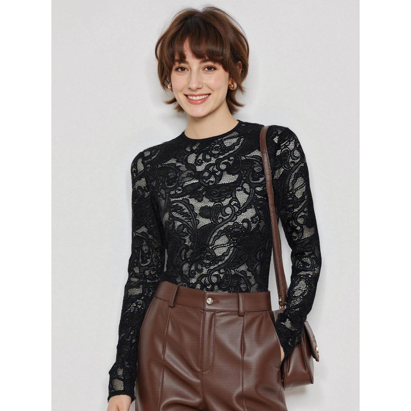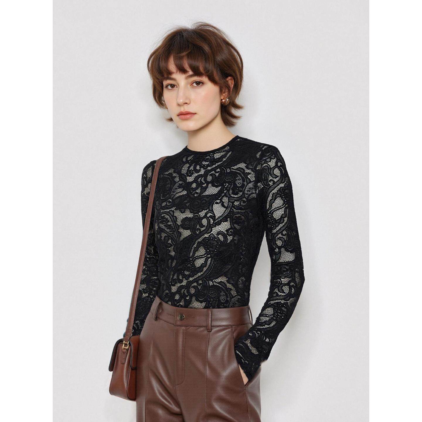 Basic House/百家好黑色蕾丝打底衫女士2026春季新款网纱长袖上衣
