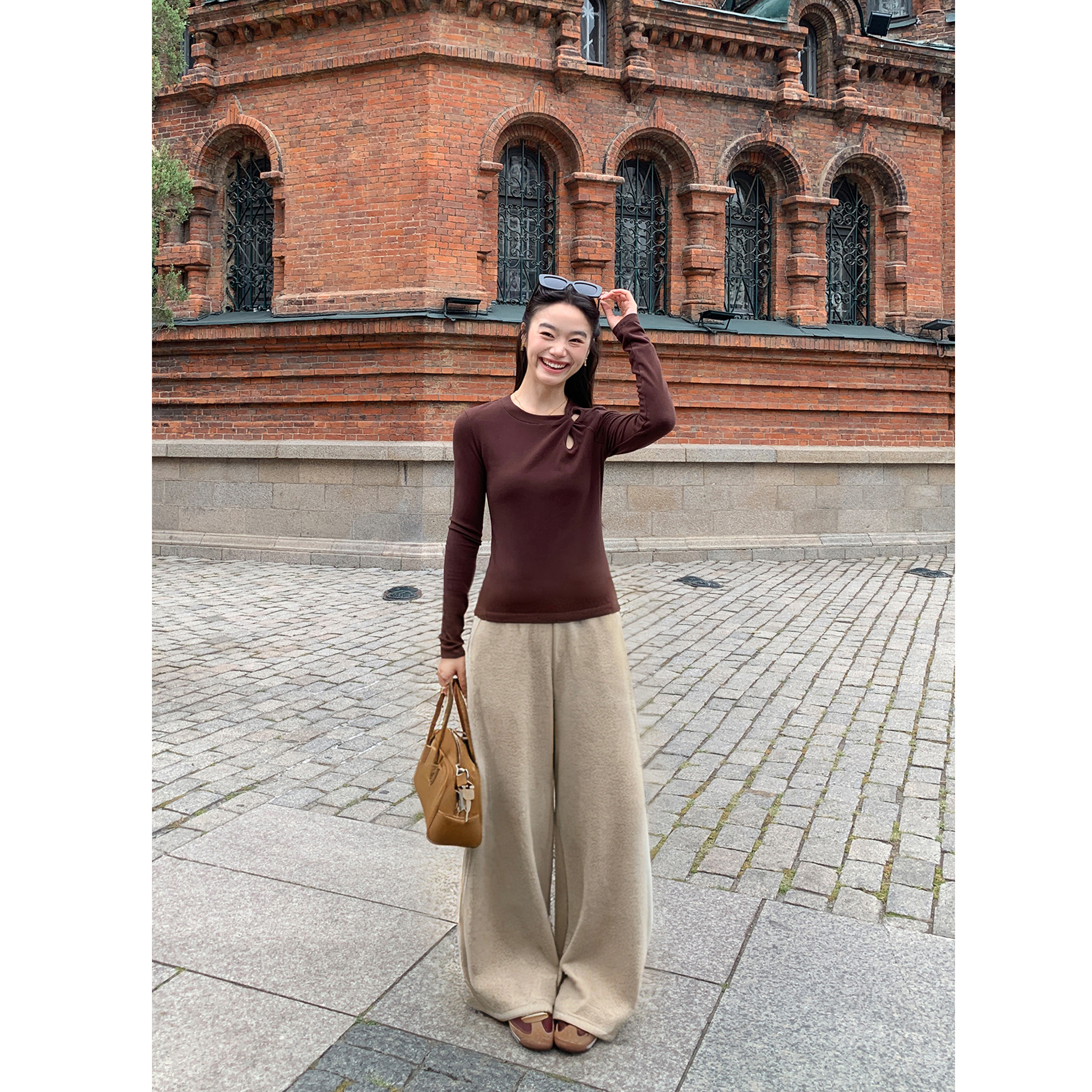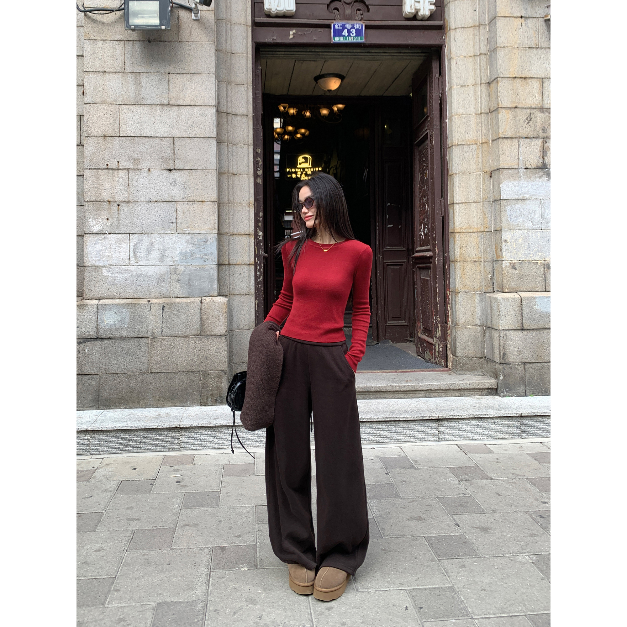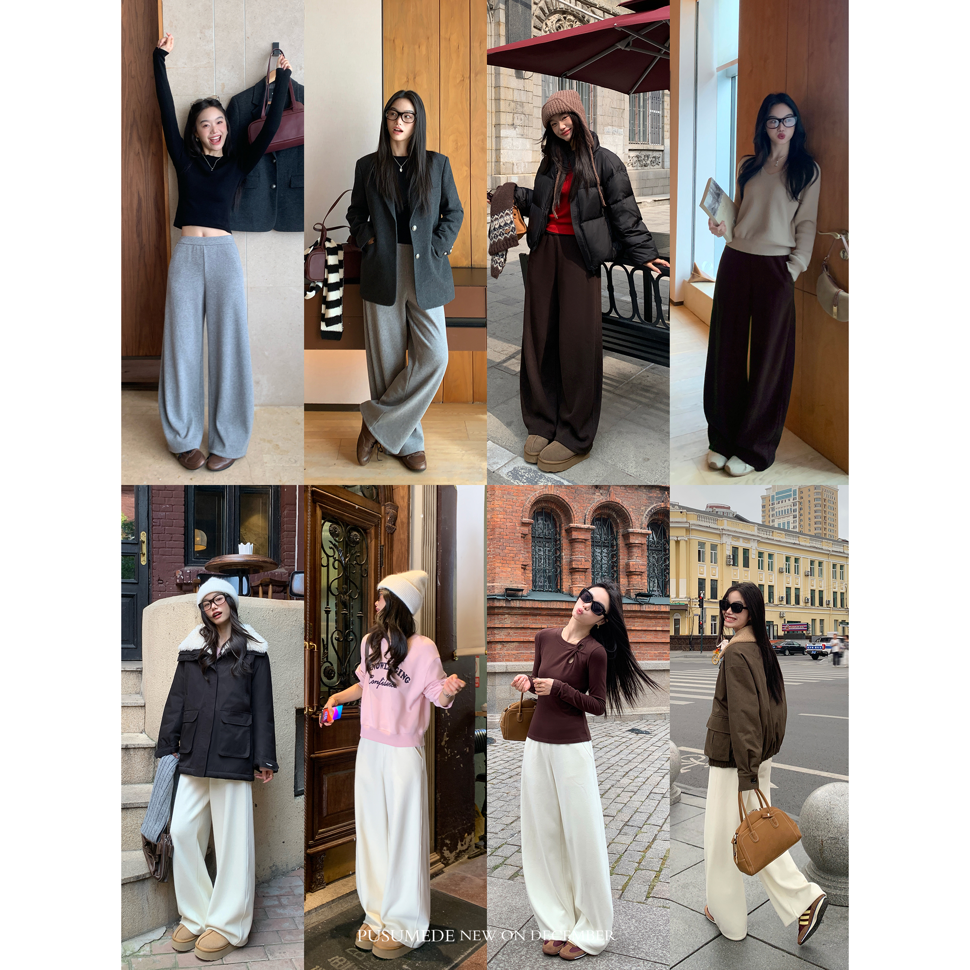 pusumede 轻松步调 白色加绒软糯弯刀裤女慵懒风休闲直筒阔腿卫裤