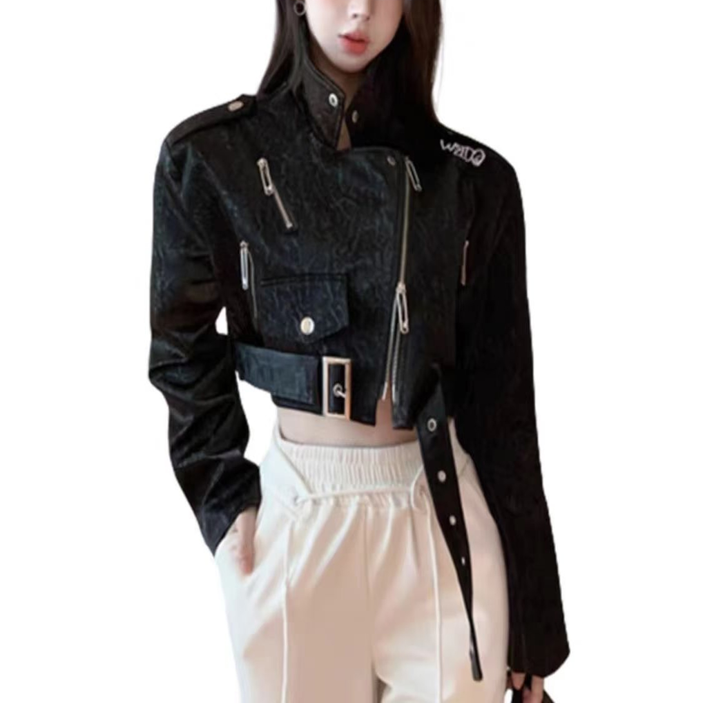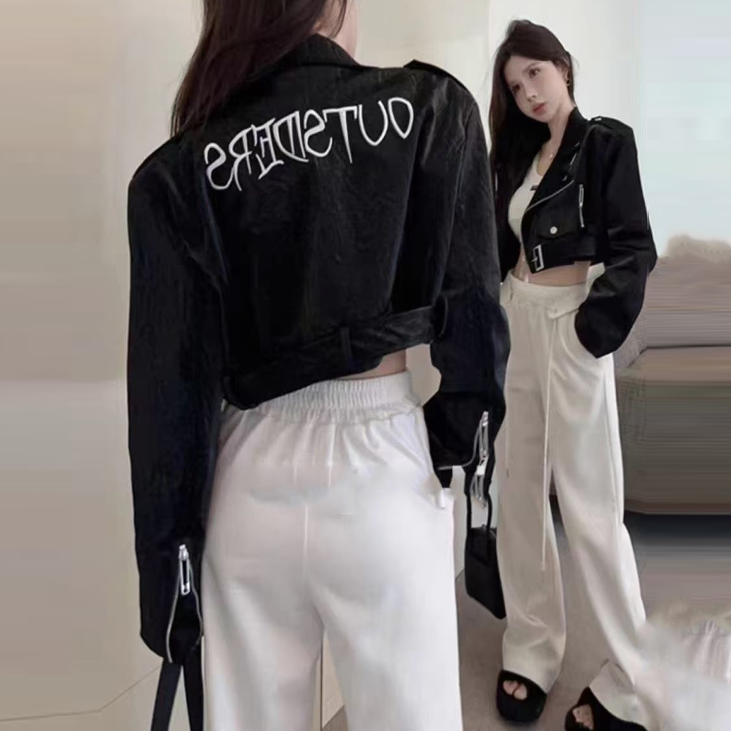 美式流行酷飒风黑色刺绣pu皮衣外套女秋季新款炸街个性机车短夹克