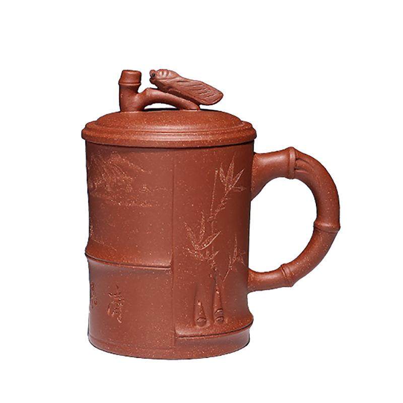 宜兴紫砂杯带盖全手工知足竹节男士办公室泡茶杯降坡泥480ml盒装