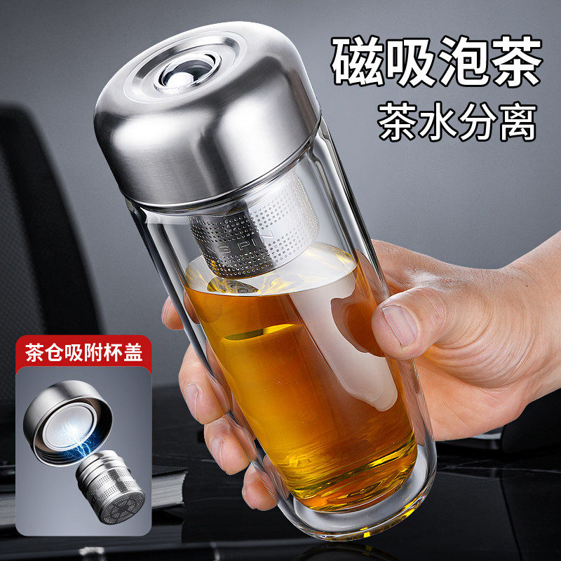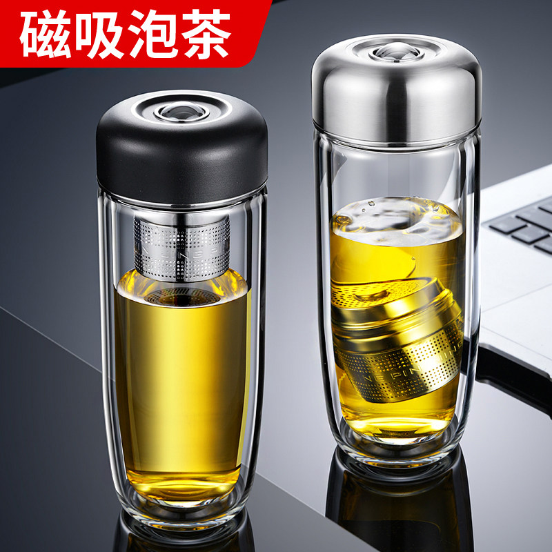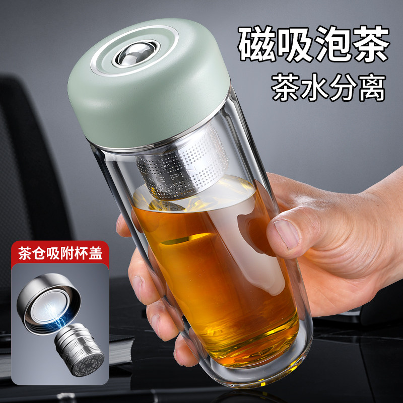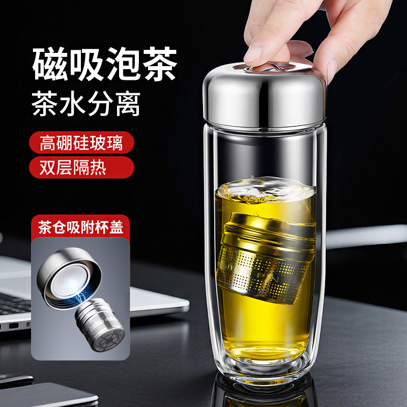 新款双层玻璃杯磁吸茶水分离泡茶办公室茶杯大容量耐热鹅蛋杯车载