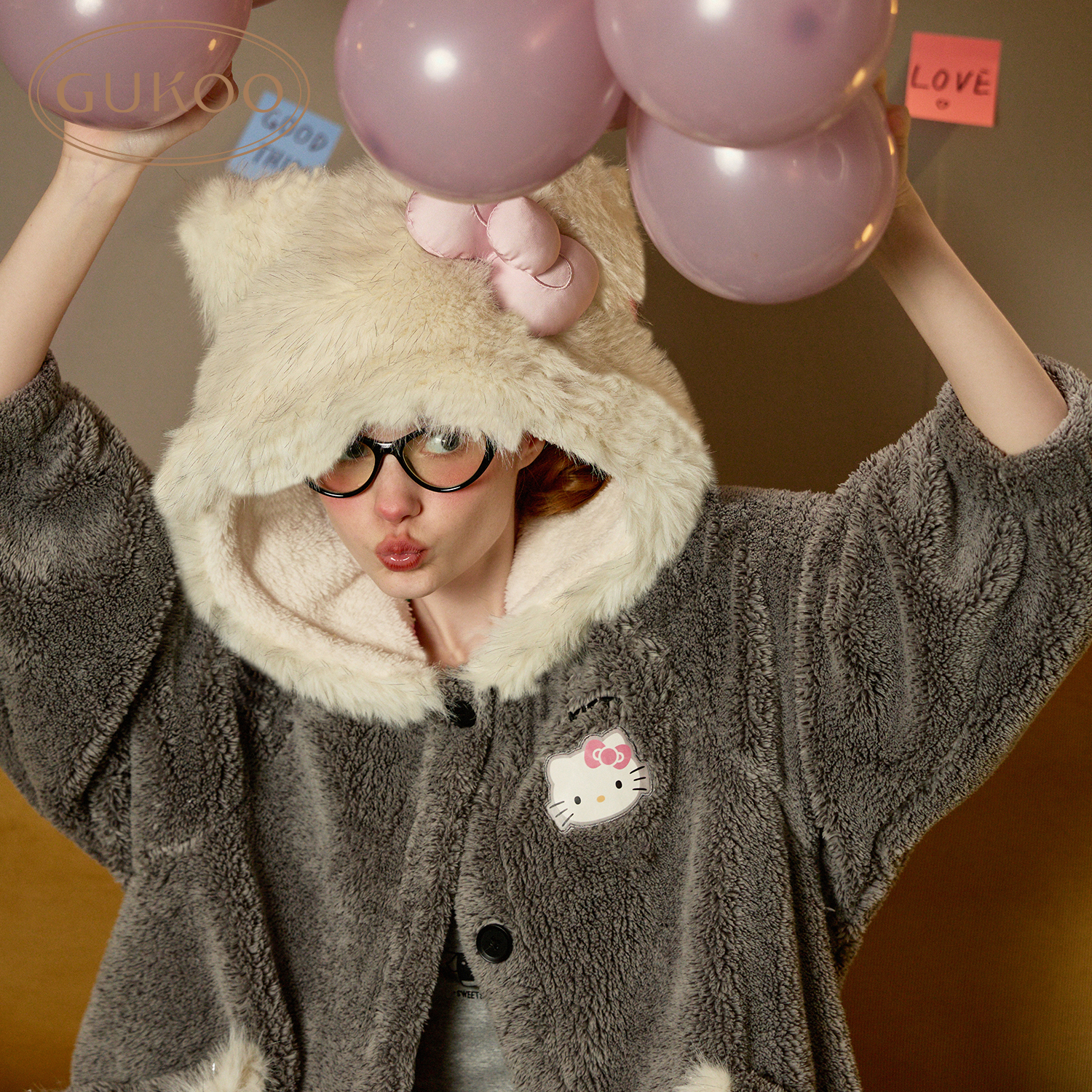 Gukoo/果壳新款睡衣女冬季HelloKitty联名可爱睡袍家居服珊瑚绒D