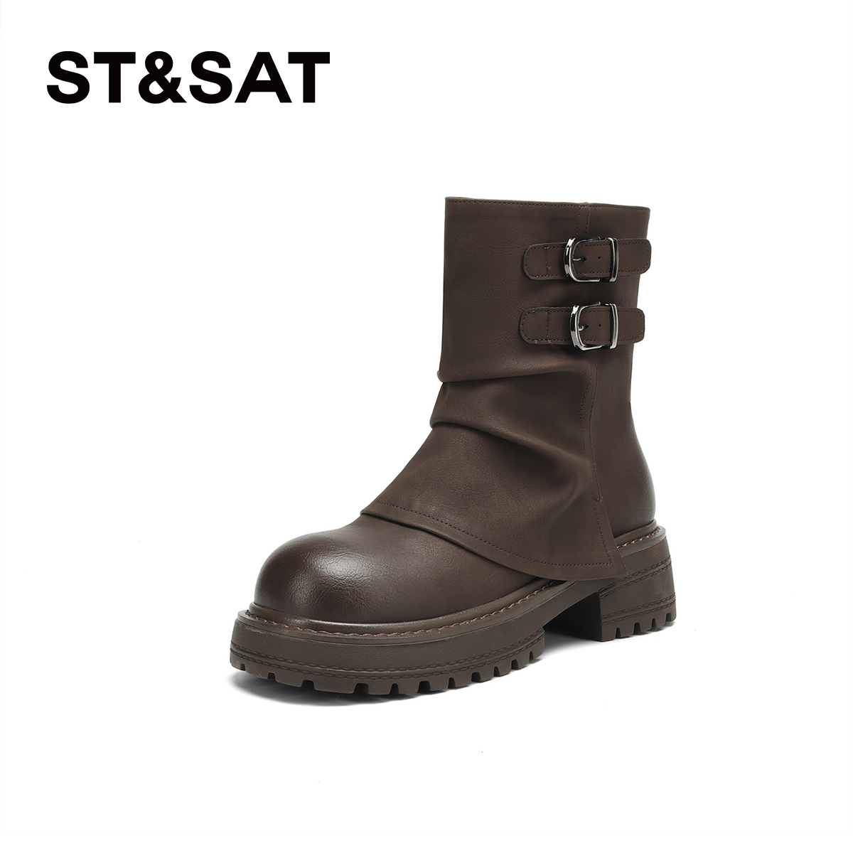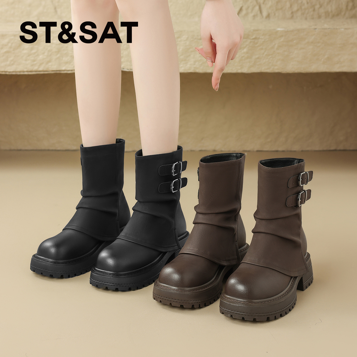 星期六复古皮带扣骑士靴女靴子2025新款秋季厚底马丁靴堆堆靴短靴