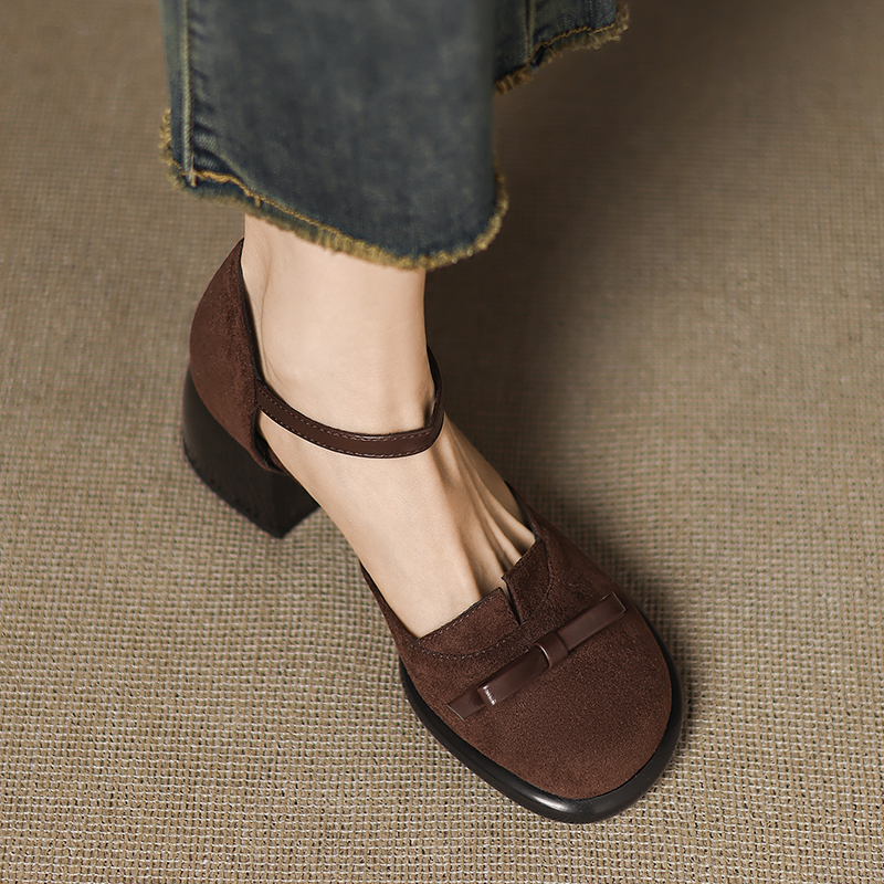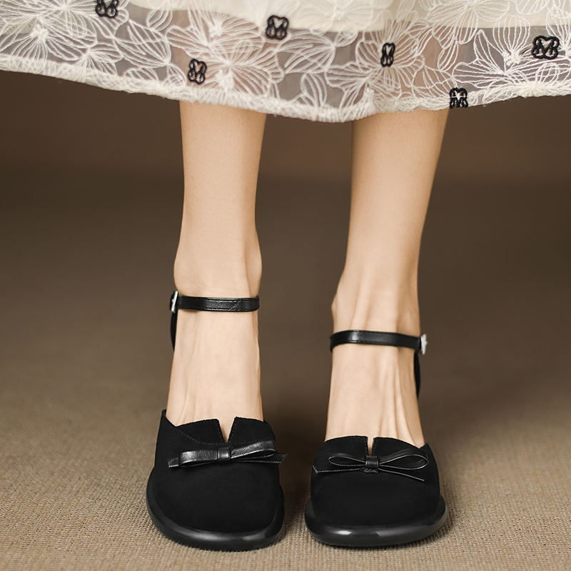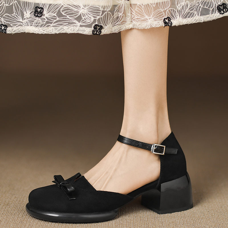 Dale~甜美复古 圆头粗跟百搭蝴蝶结中空凉鞋女休闲一字带单鞋大码