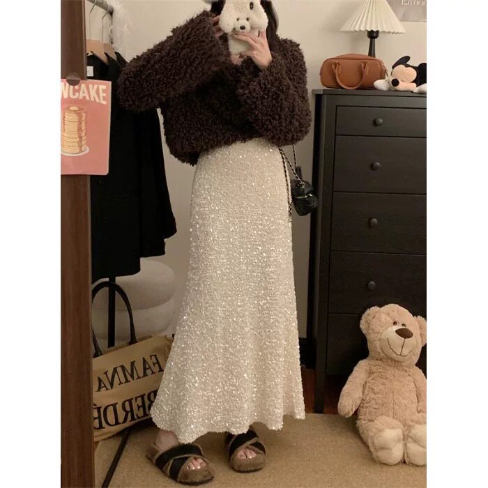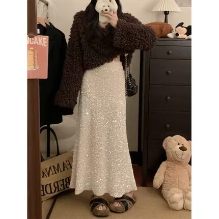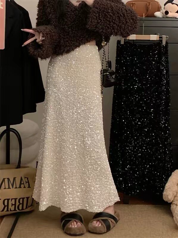 (现货)亮片半身裙女春季新款松紧高腰显瘦垂感a字包臀鱼尾长裙