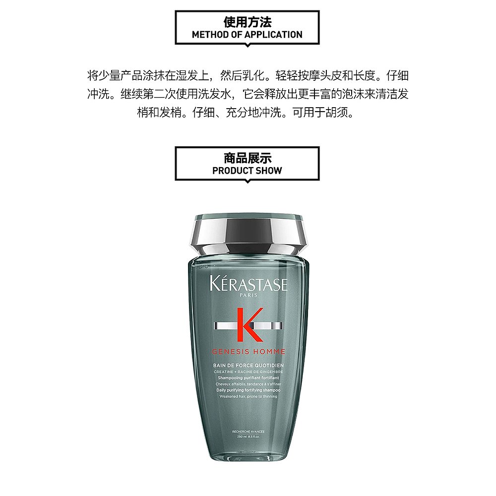 欧洲直邮Kerastase/卡诗Genesis系列男士防脱洗发水250ml 强化发
