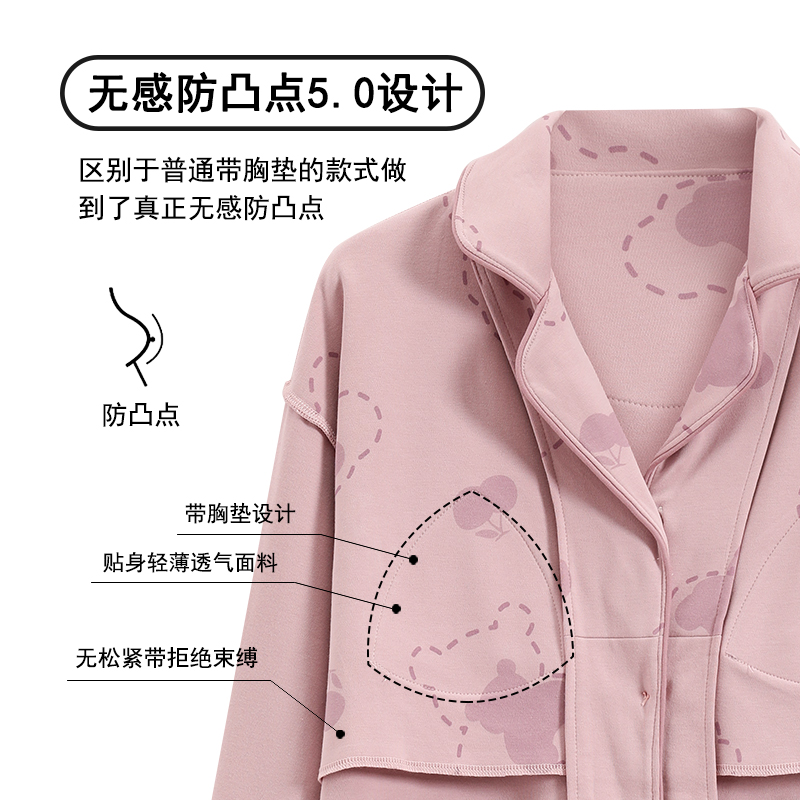 浪莎春秋季带胸垫睡衣女纯棉长袖开衫免穿文胸可外出家居服两件套