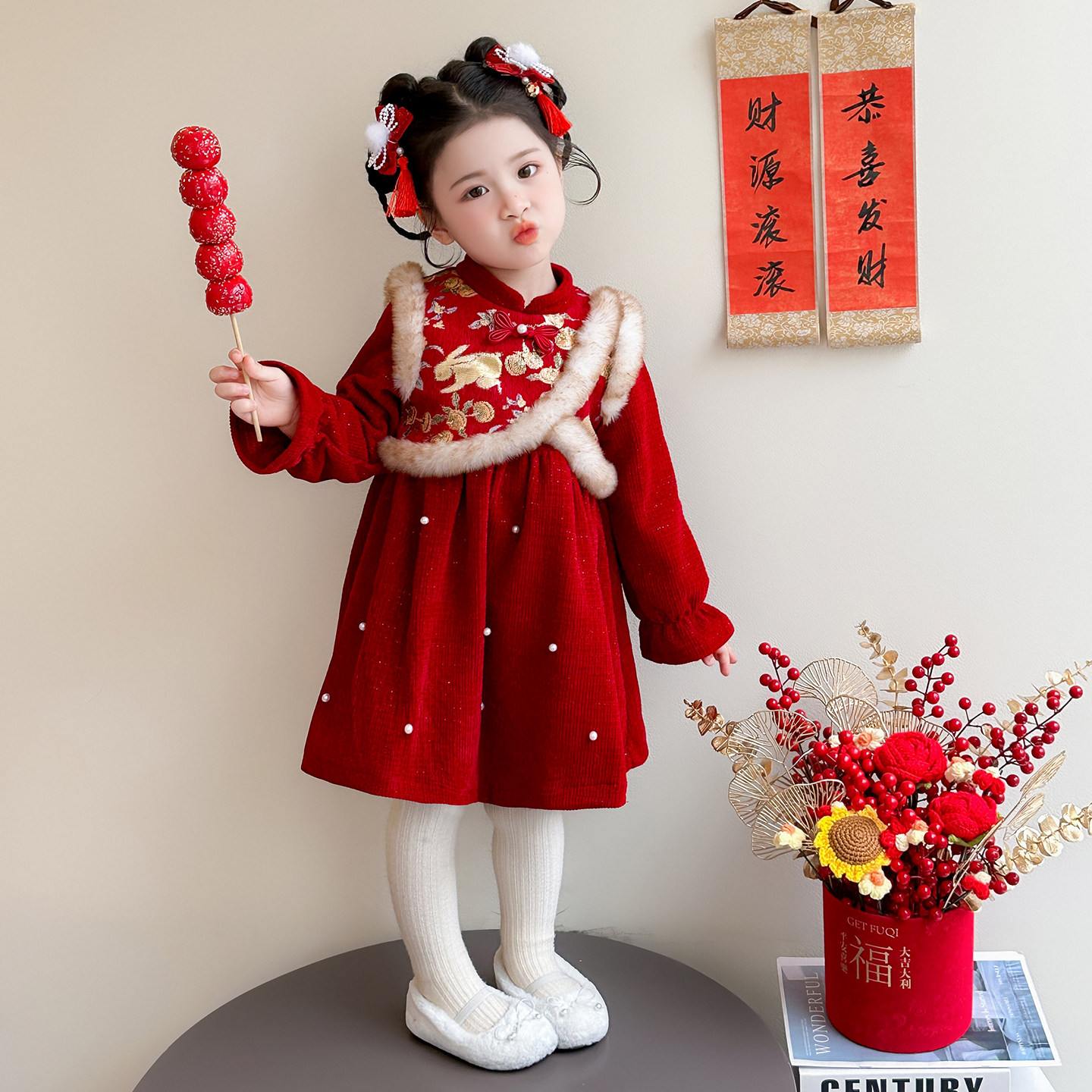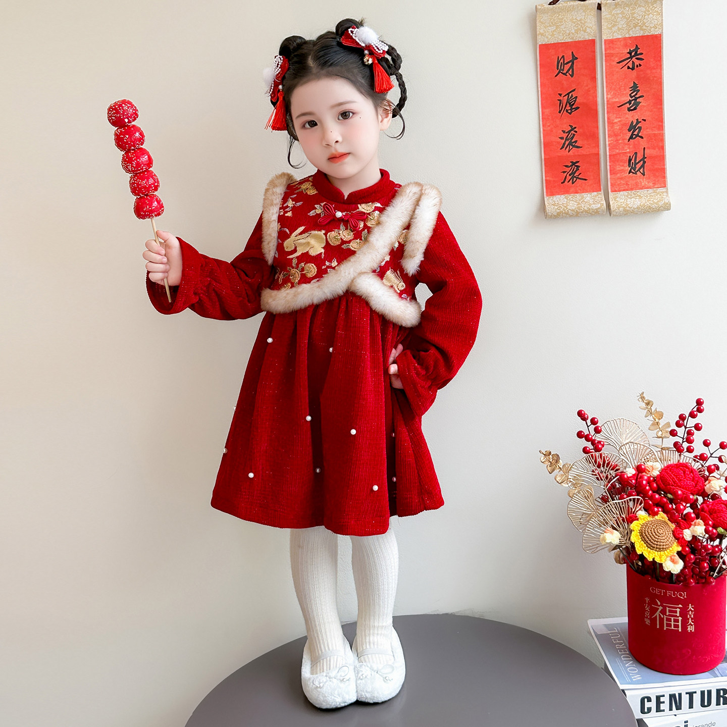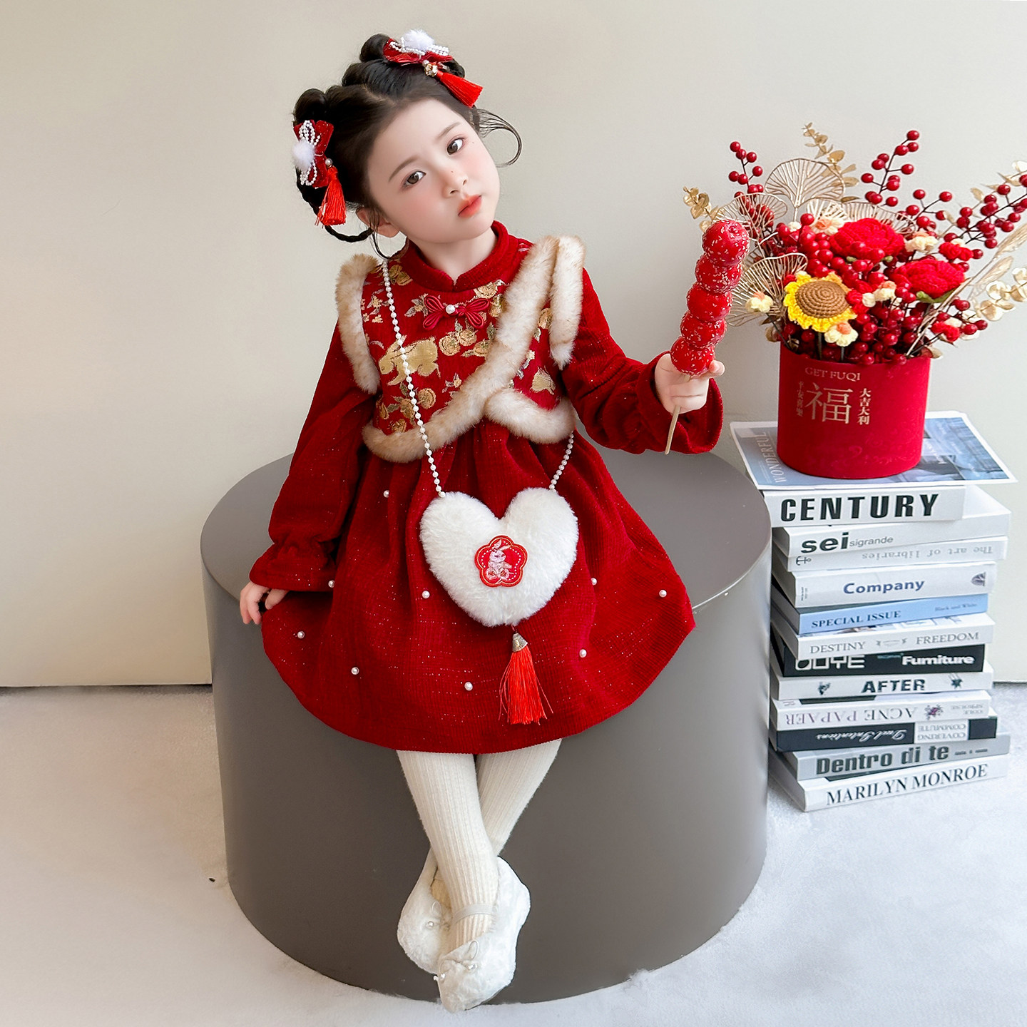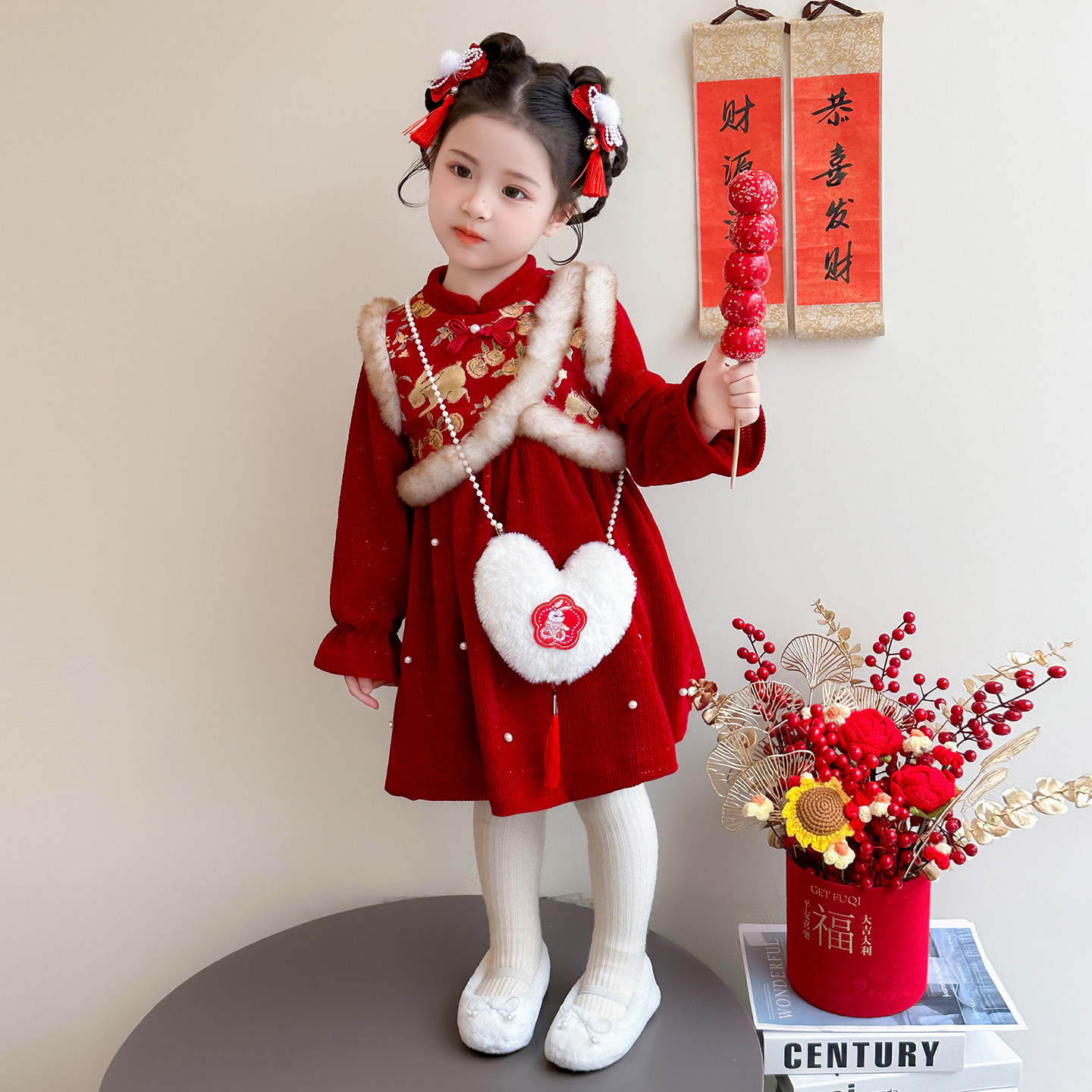 女童爱心连衣裙红色秋冬装儿童冬季拜年服过年喜庆新年女宝宝裙子
