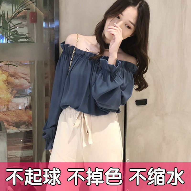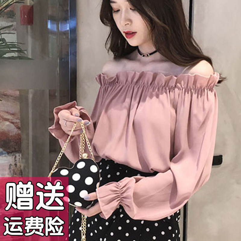 大码一字肩上衣女夏法式锁骨雪纺衫长袖小衫露肩荷叶边胖mm200斤