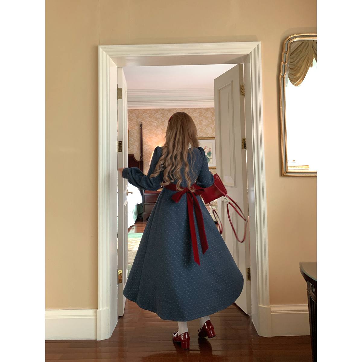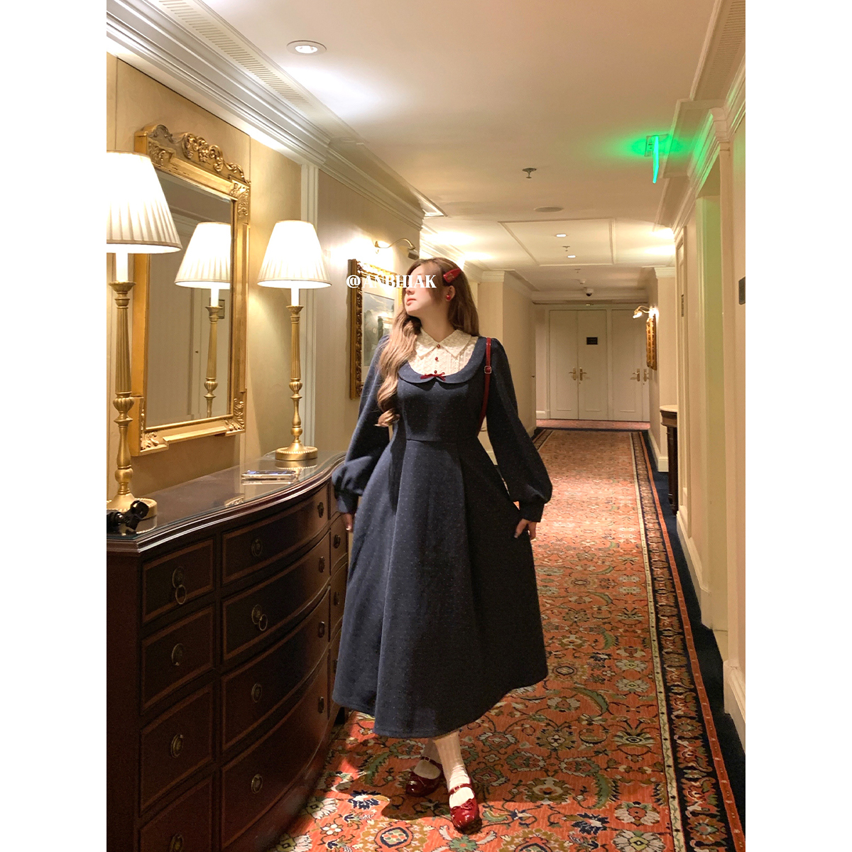 安妮不火 假两件波点印花绑带呢子连衣裙女微胖大码收腰千金风裙