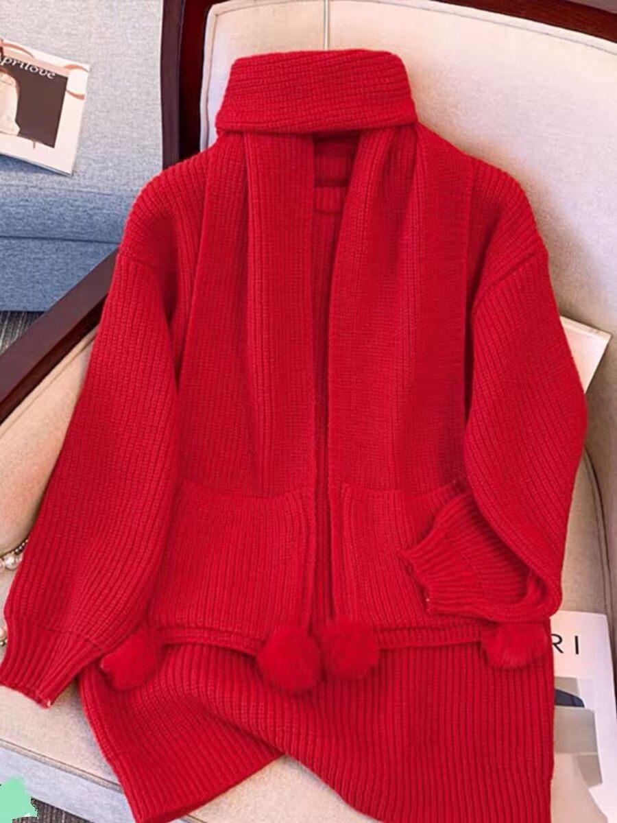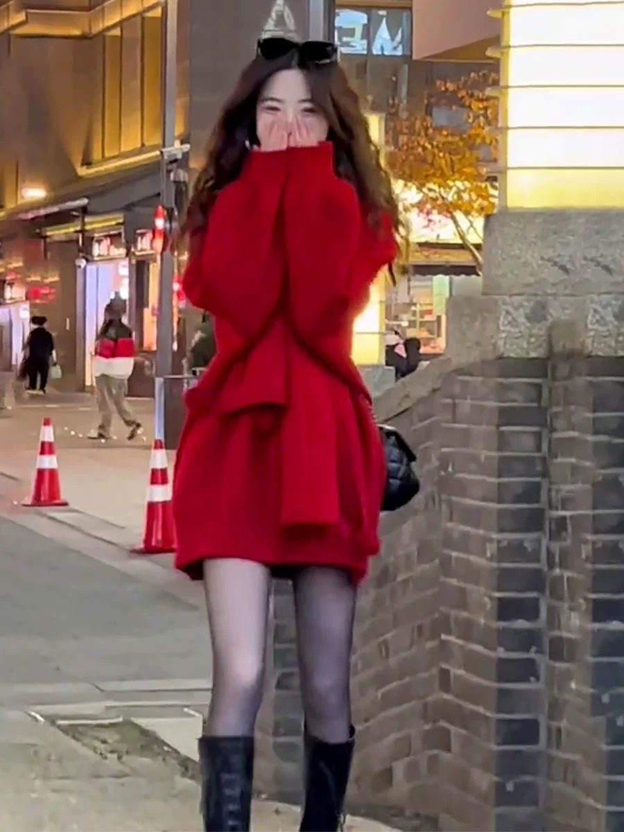 圣诞穿搭红色毛衣女秋冬季2025新款小个子宽松中长款针织衫慵懒风