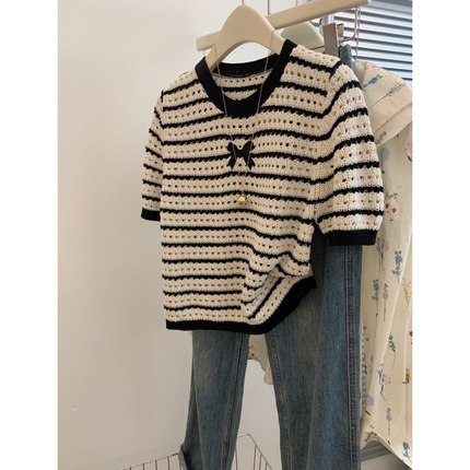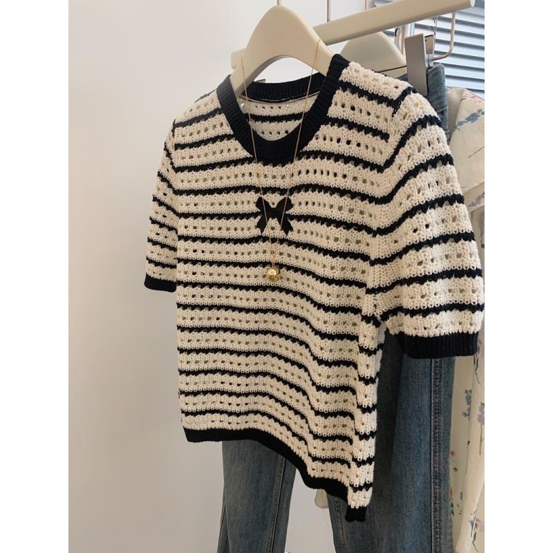 条纹撞色圆领冰丝针织上衣女夏季短款设计感小众薄款短袖正肩t恤