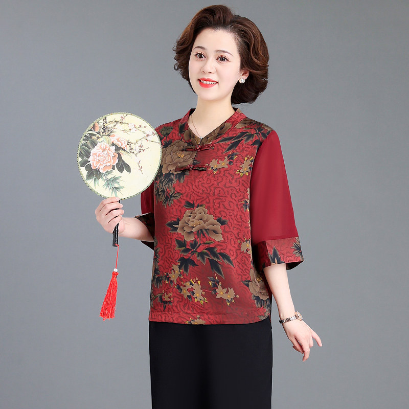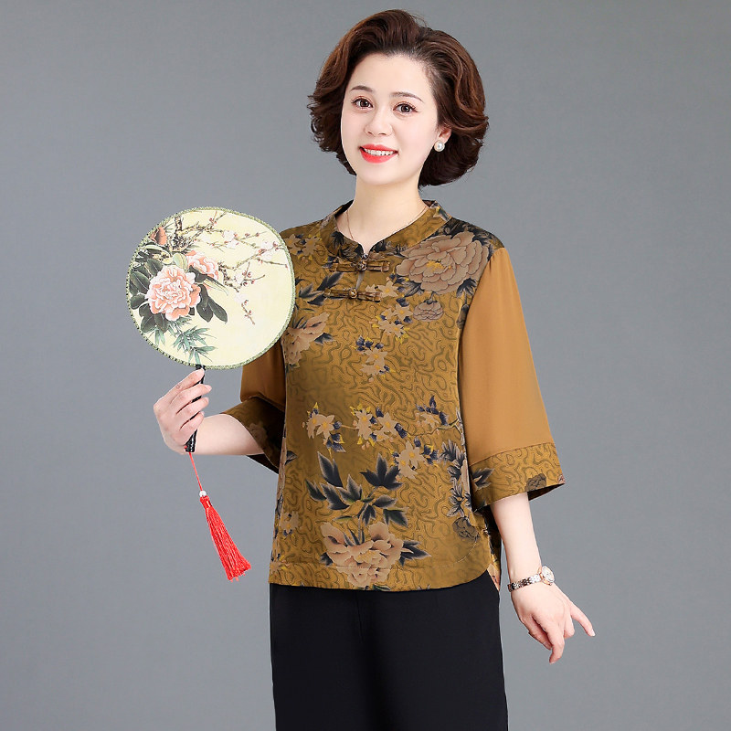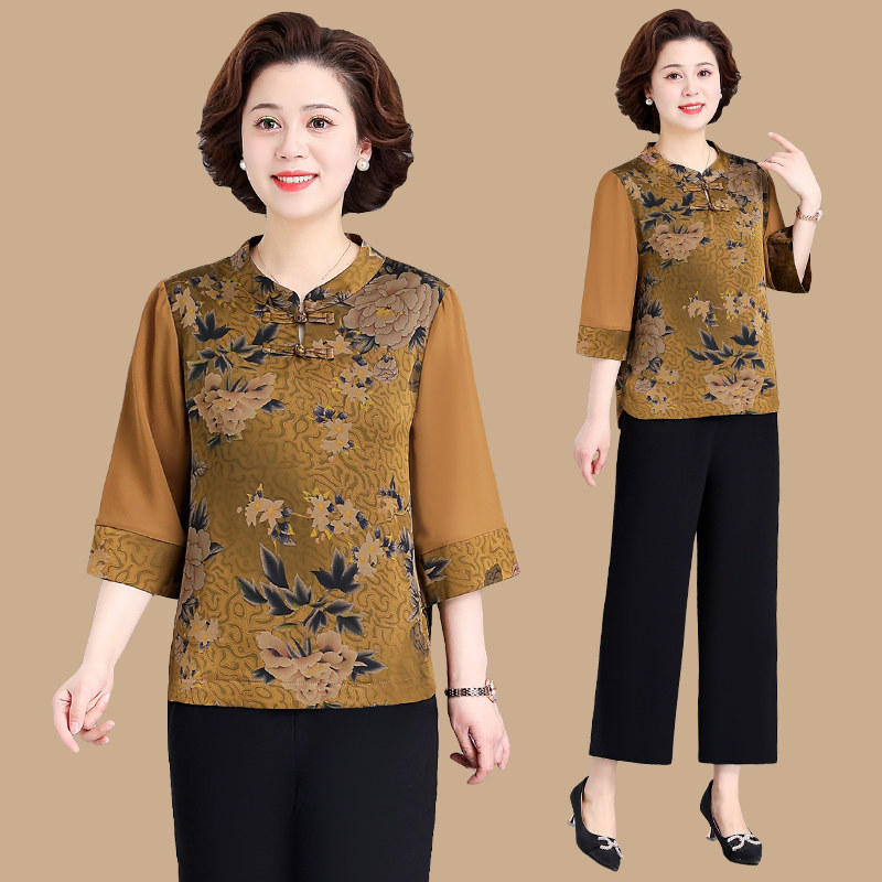 中老年妈妈夏季七分袖雪纺衫运动服女老人奶奶减龄上衣服两件套装