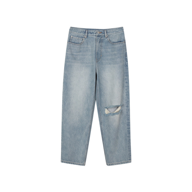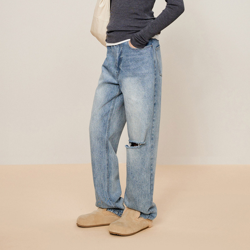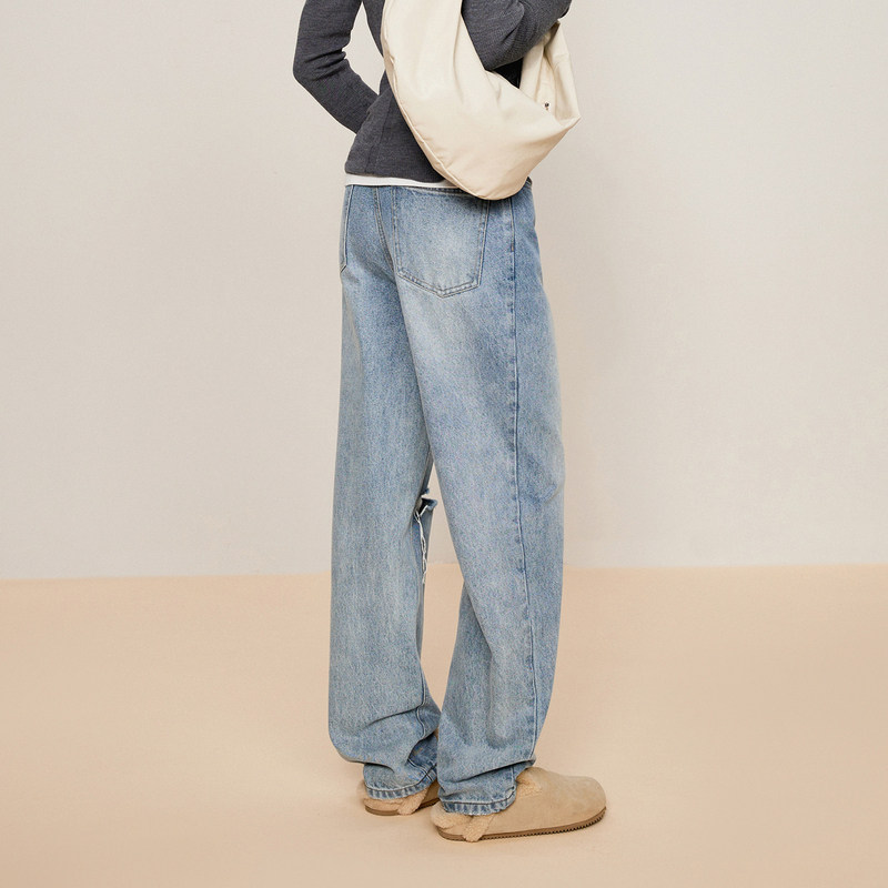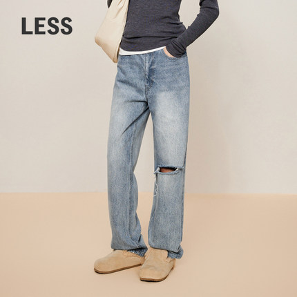 LESS春秋直筒牛仔裤女割破水洗高腰休闲棉质锥型长裤子2O9E11680