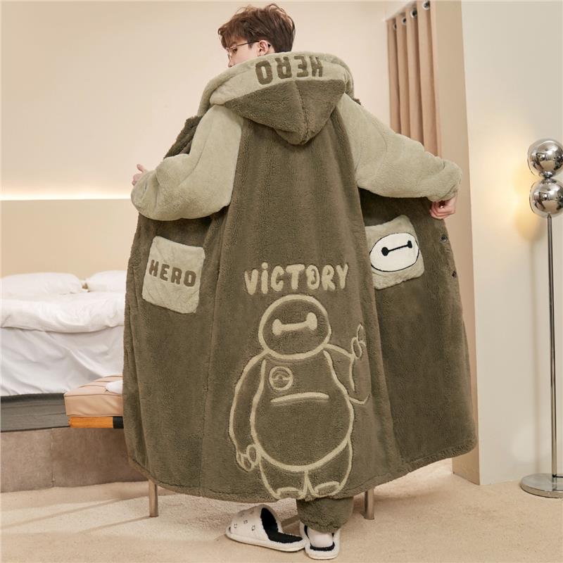 冬季加绒加厚珊瑚绒男士睡衣男款睡袍青少年学生卡通家居服秋冬款