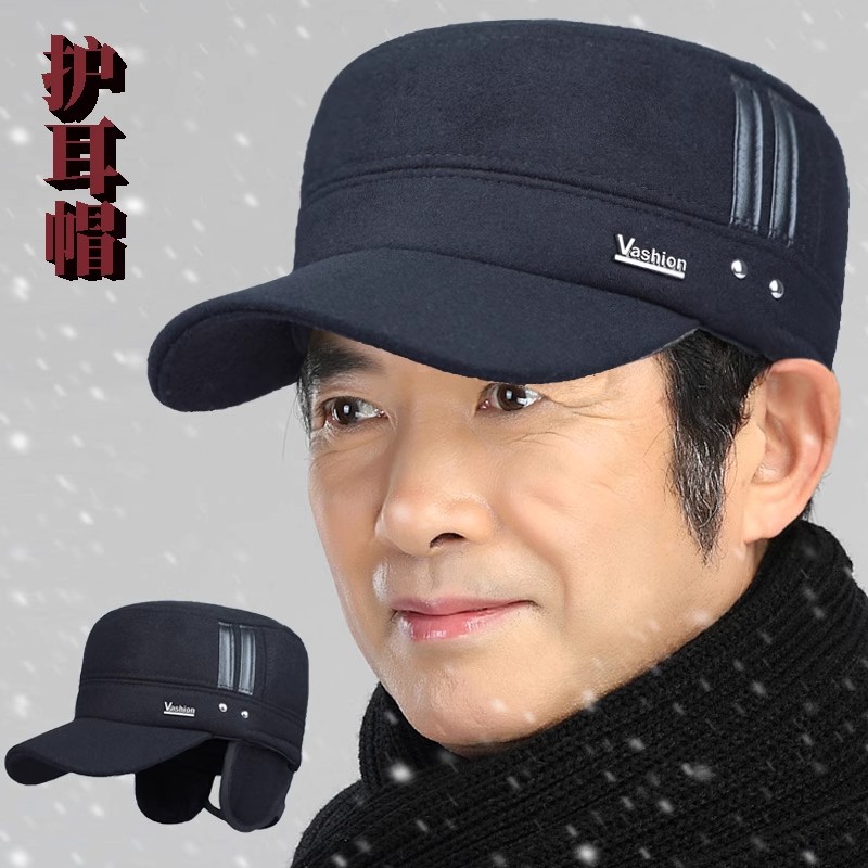 高档老人帽子男冬天户外保暖加厚平顶帽中老年加绒护耳鸭舌帽冬帽