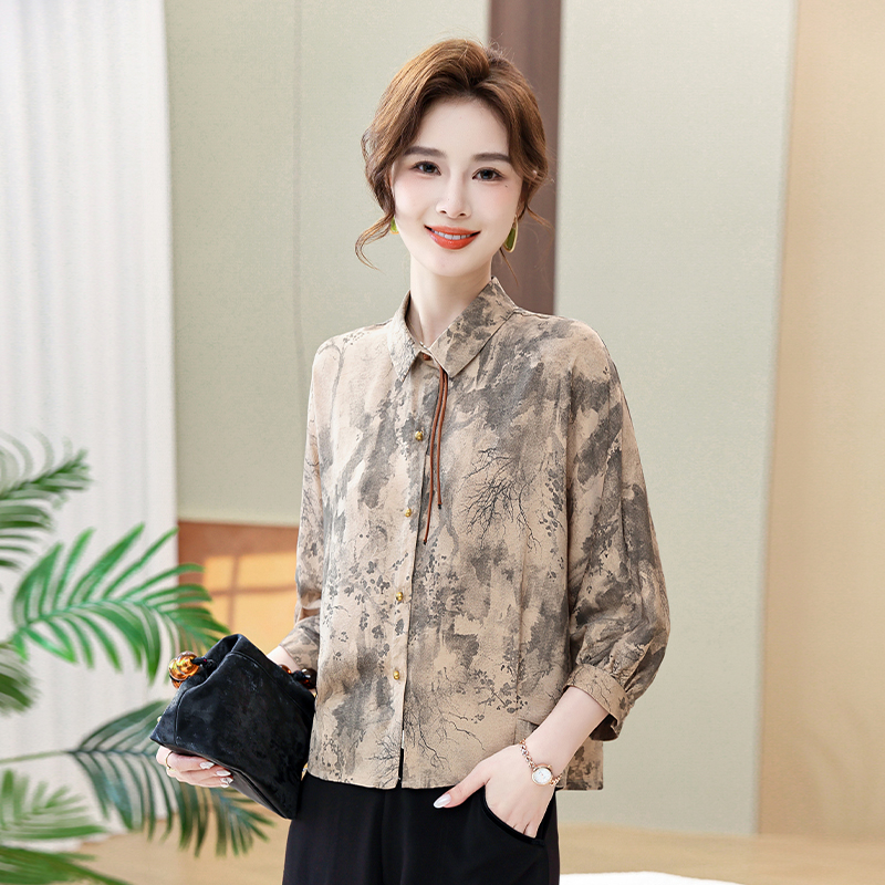 妈妈夏装洋气缎面薄款小衫中老年人女夏季半袖衬衫夏装洋气香云纱