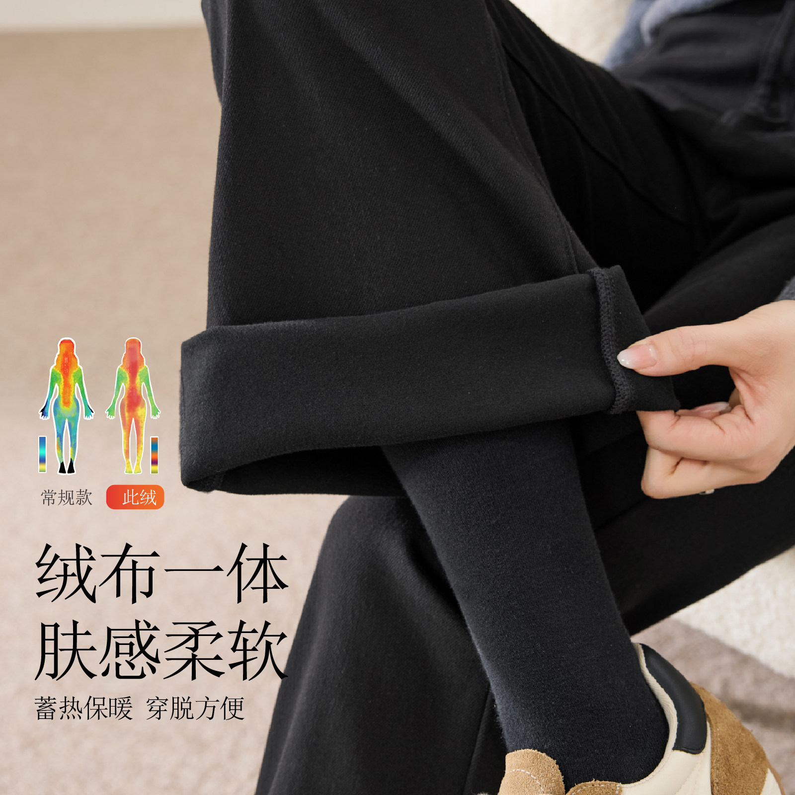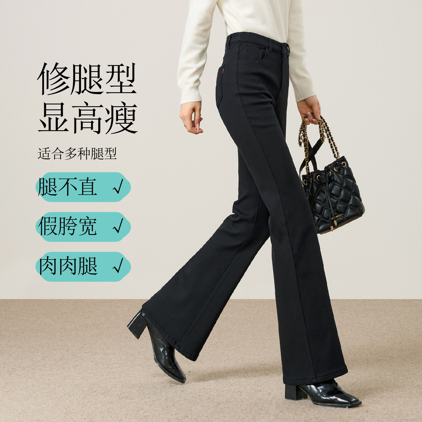 逸阳高腰黑色牛仔微喇裤拉绒长裤