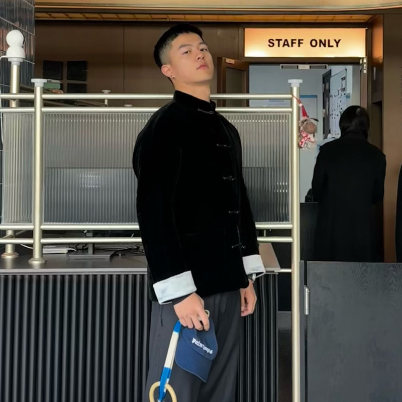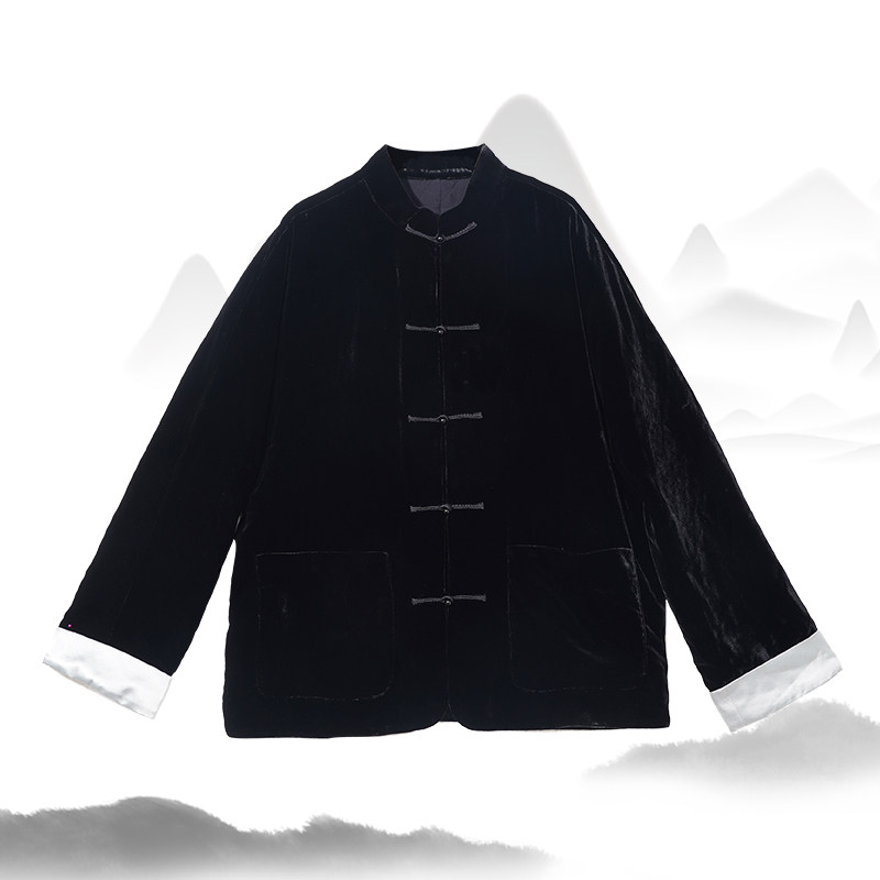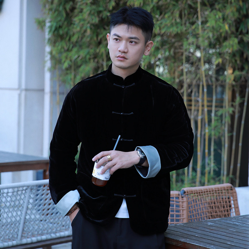 墨玉三重门秋冬真丝绒新中式夹克保暖夹棉高级盘扣唐装外套男国潮