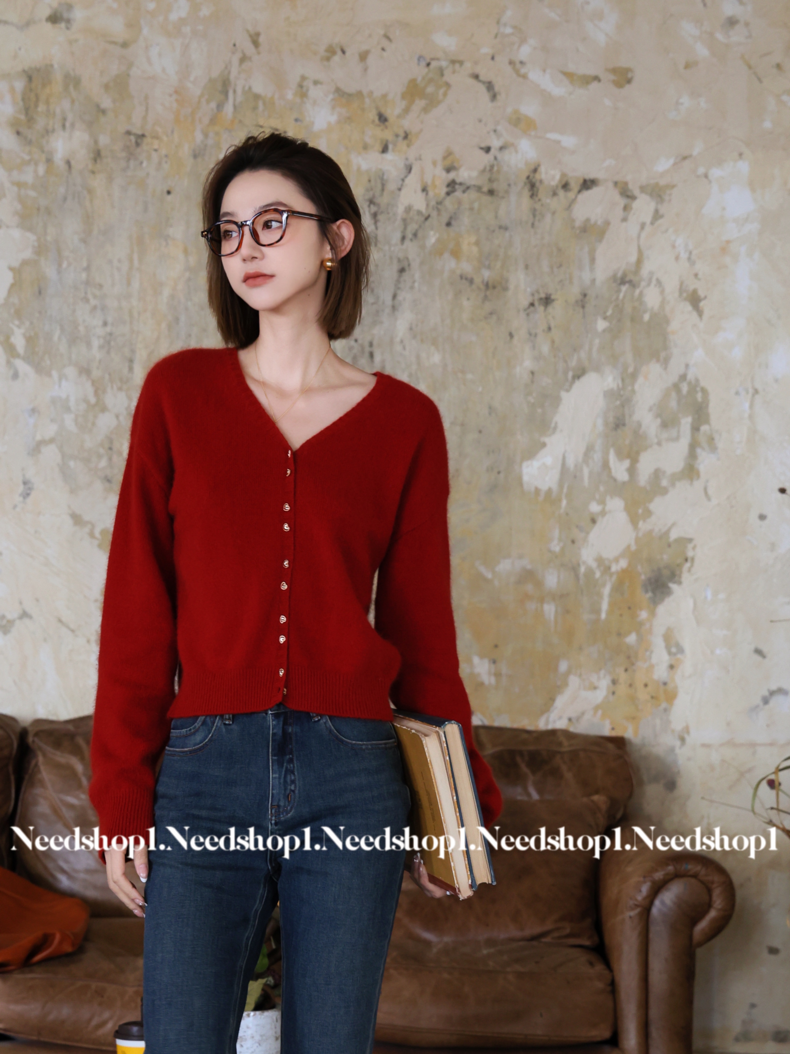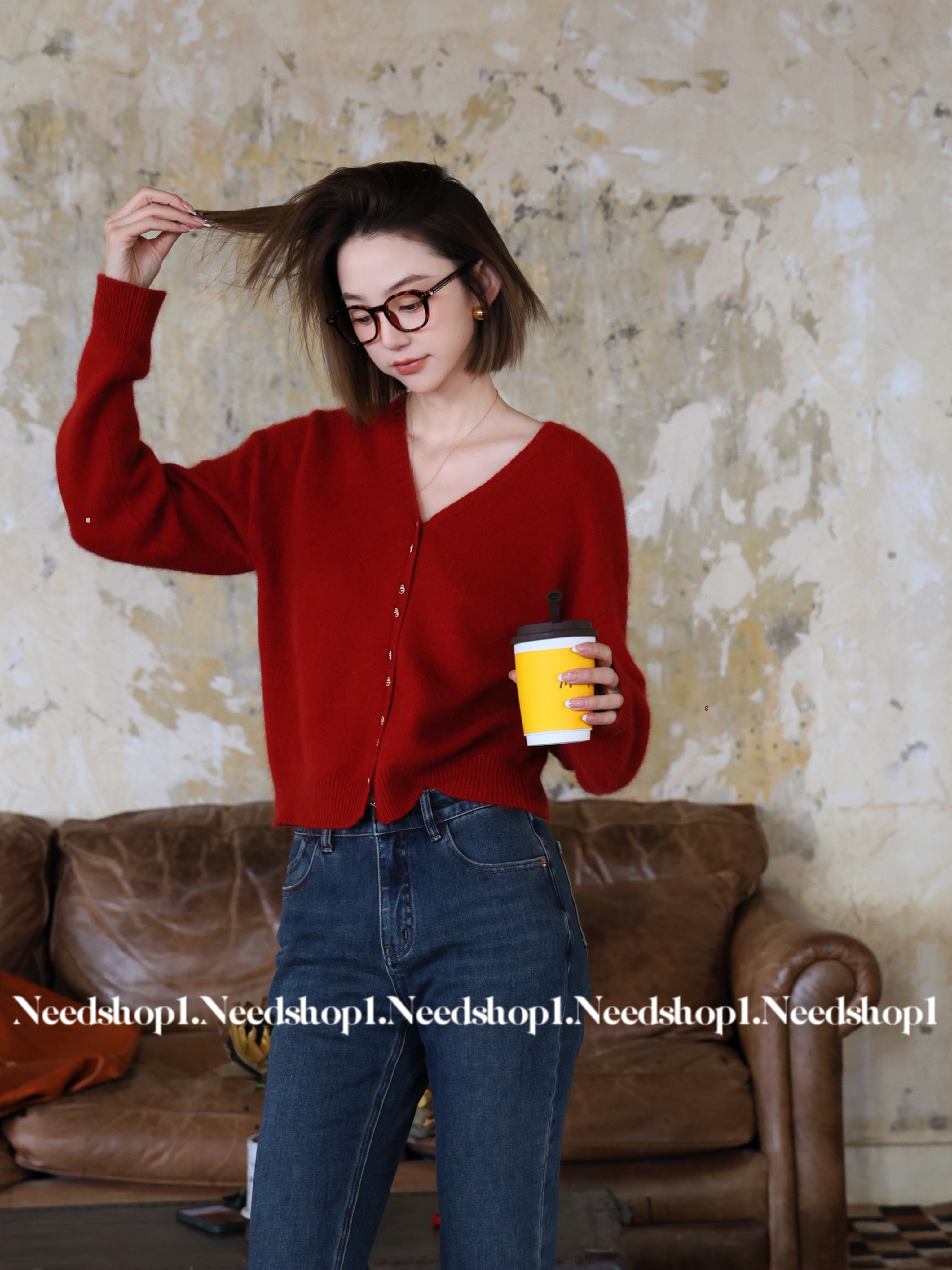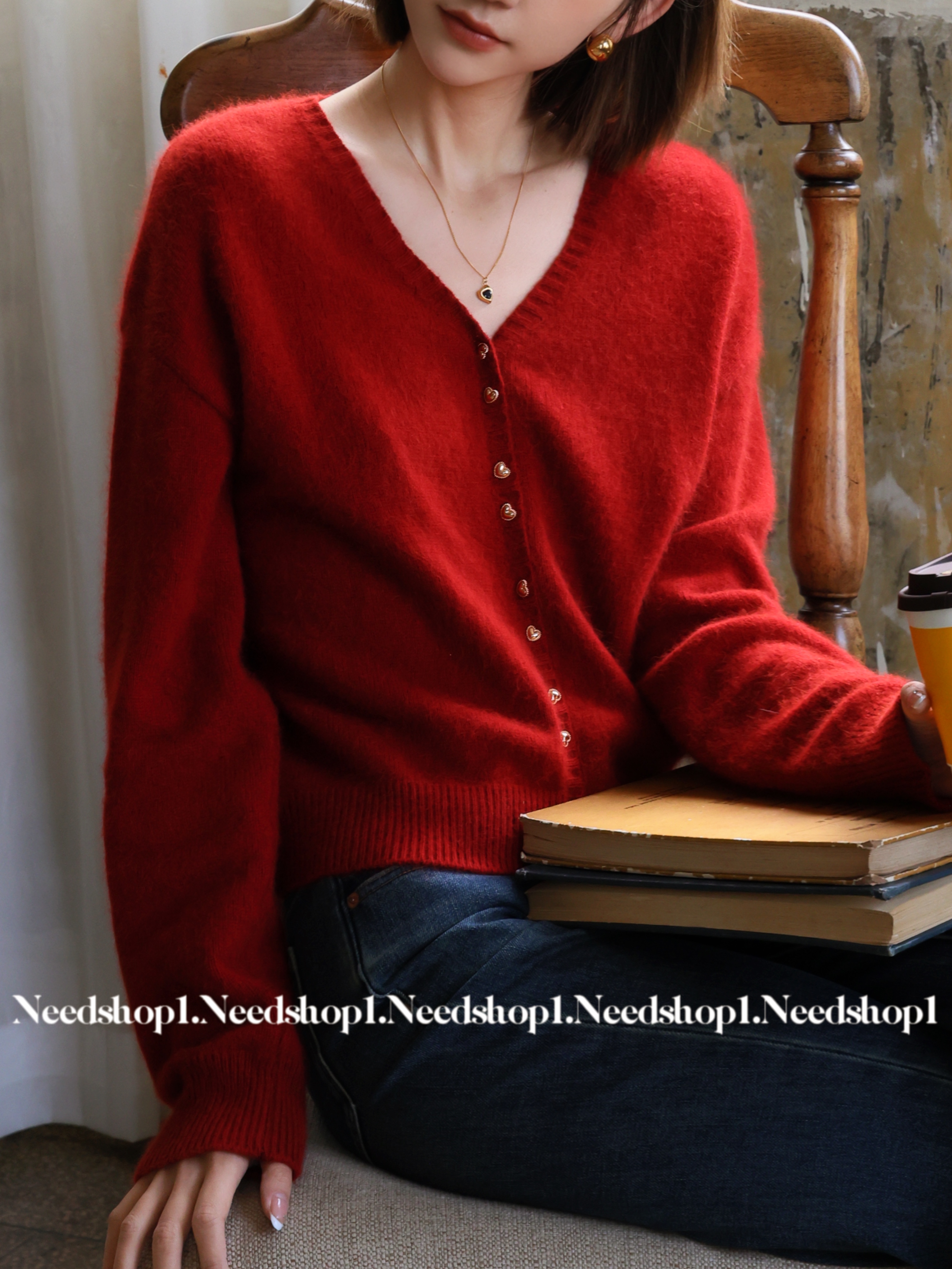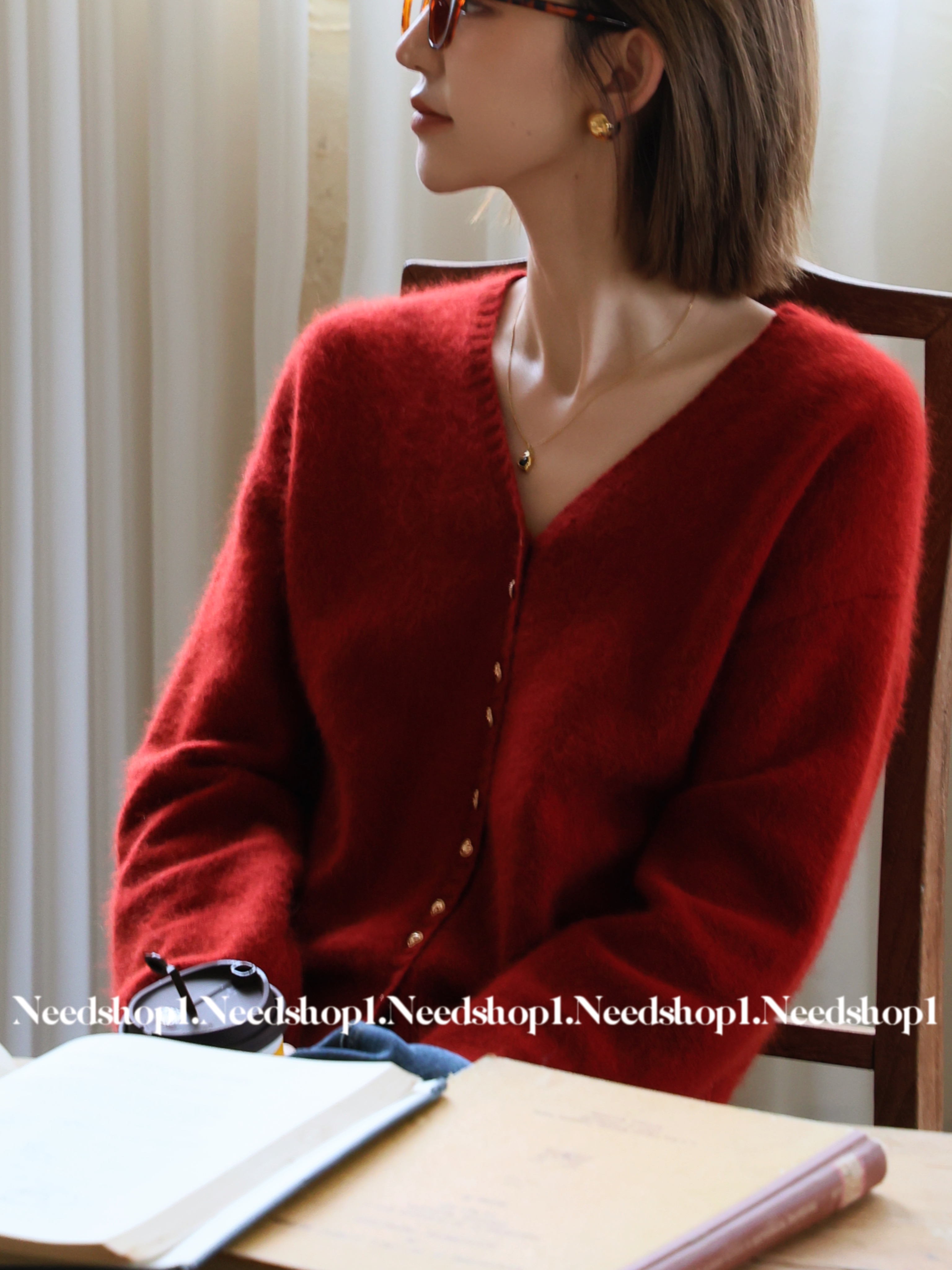 NeedShop12023冬季新款红色新年圣诞红V领软糯浣熊毛羊毛针织开衫