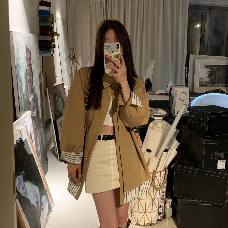 美式复古日系宽松衬衫外套女春秋设计感小众假两件韩系休闲上衣