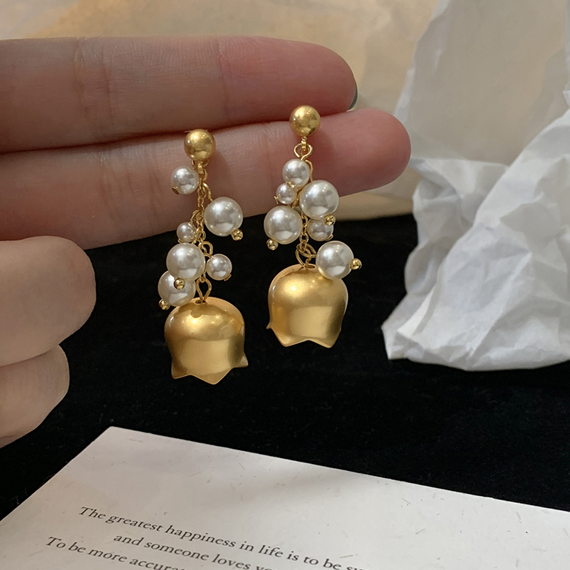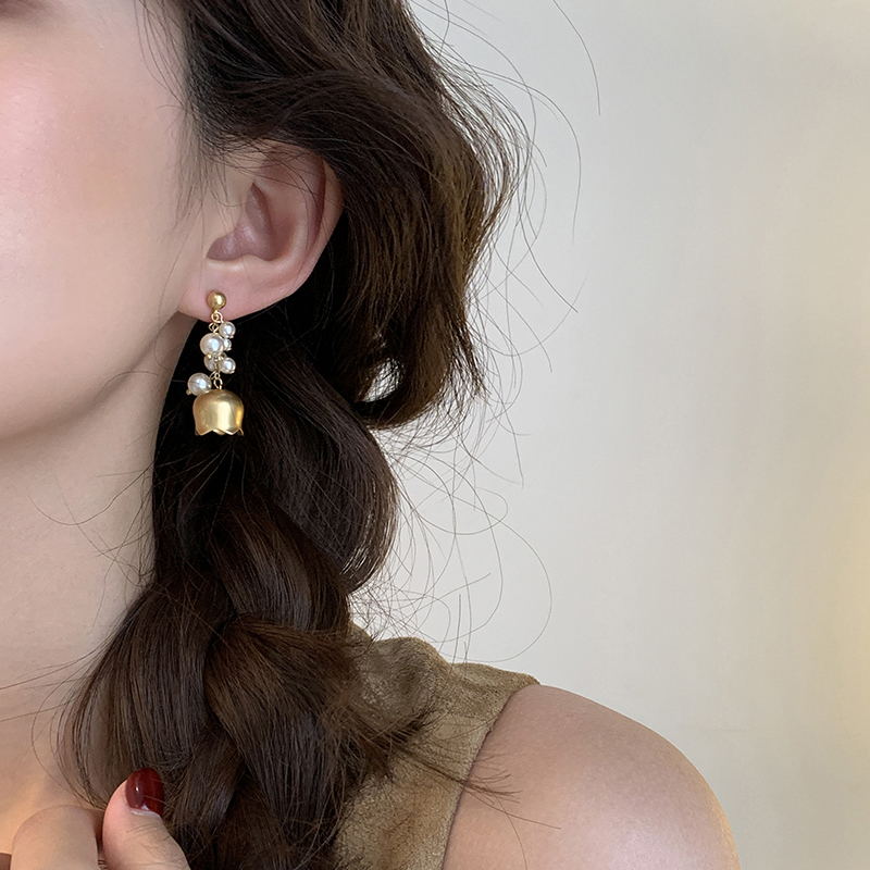 迷度S925银针复古雾面铃兰花耳环珍珠耳钉长款耳线女优雅小众耳坠