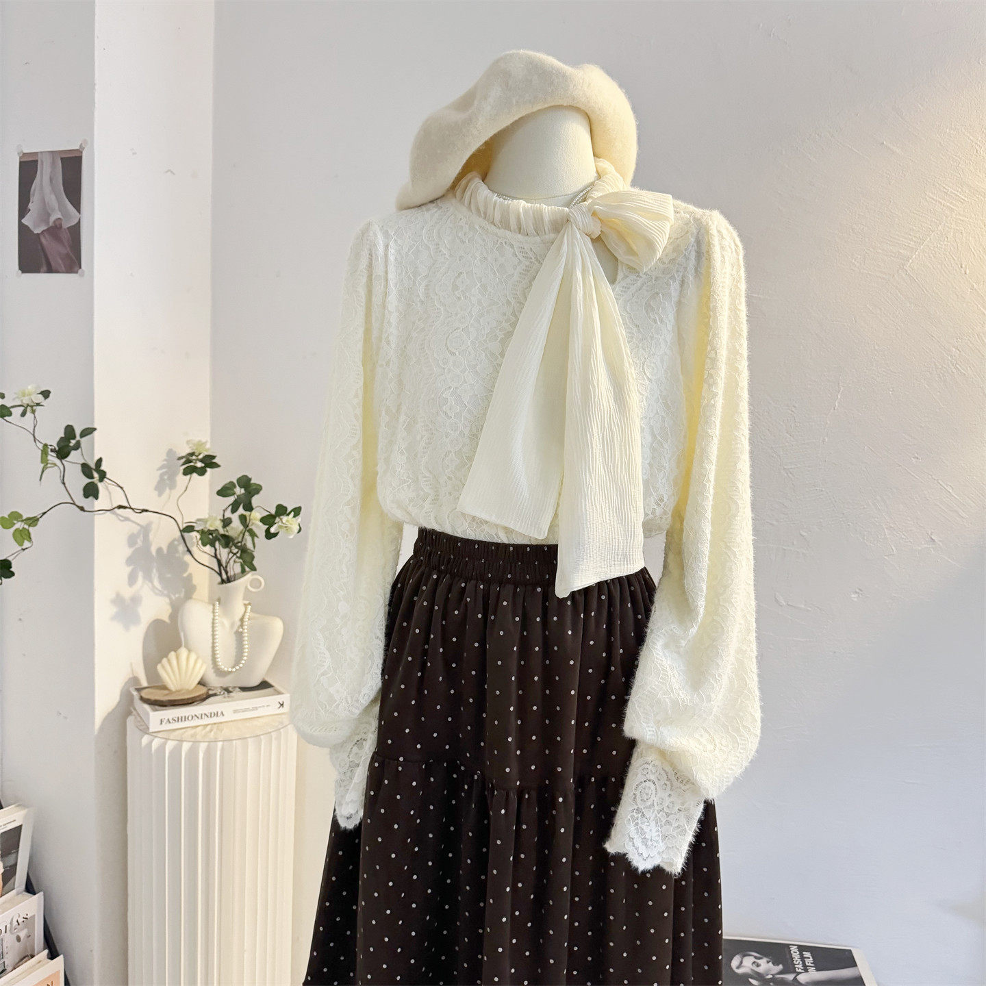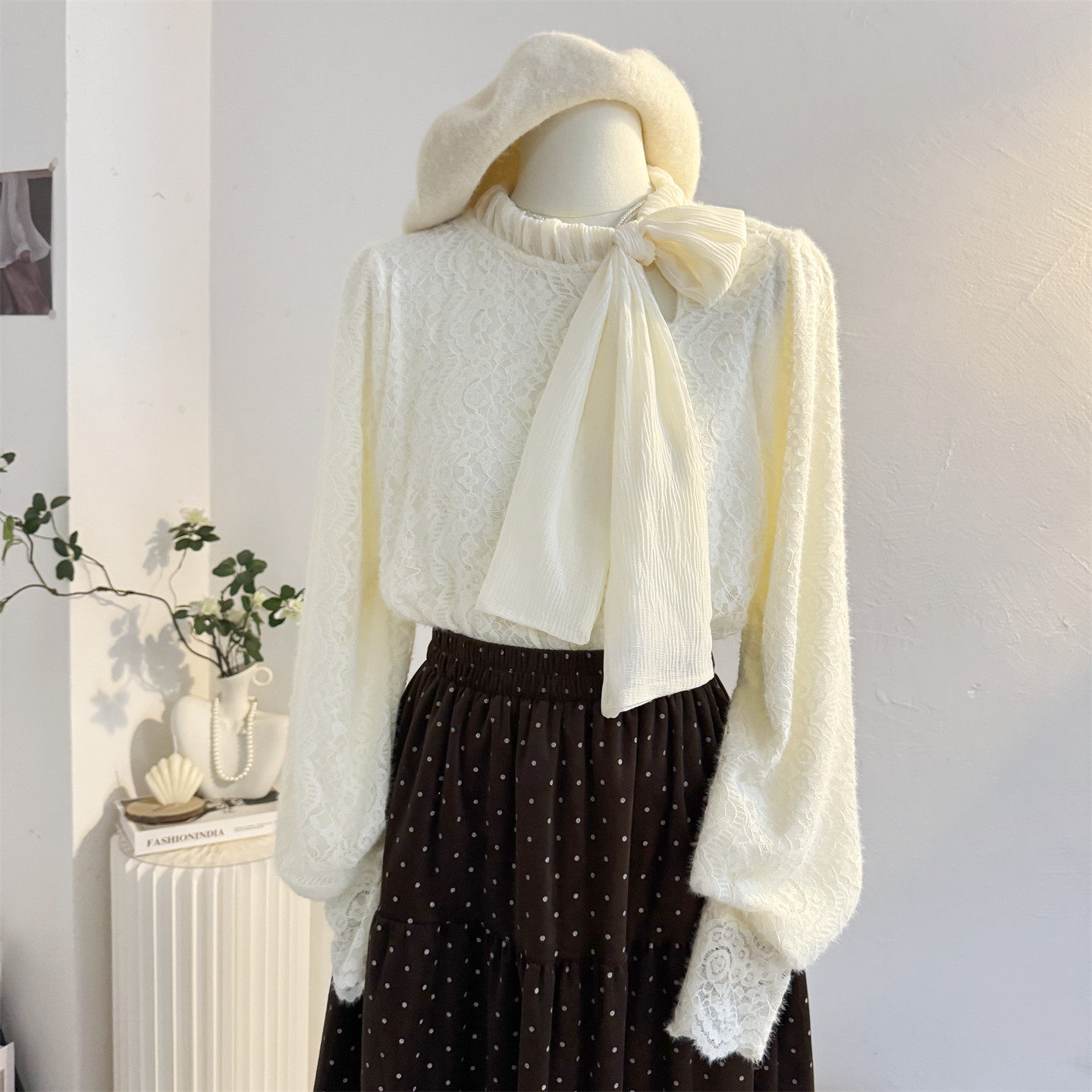 系带蝴蝶结加绒蕾丝衫长袖衬衫女2025秋冬季加厚内搭打底小衫上衣