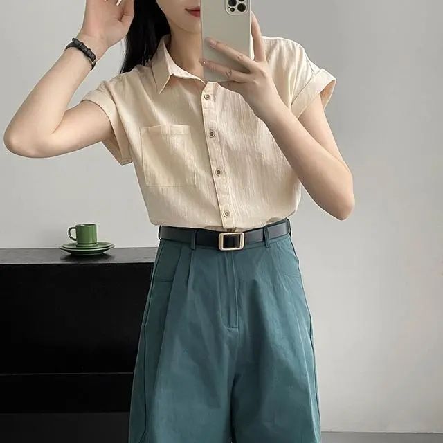 夏季新款上衣设计感小众短袖衬衫女装时尚韩版宽松遮肚子显瘦衬衣