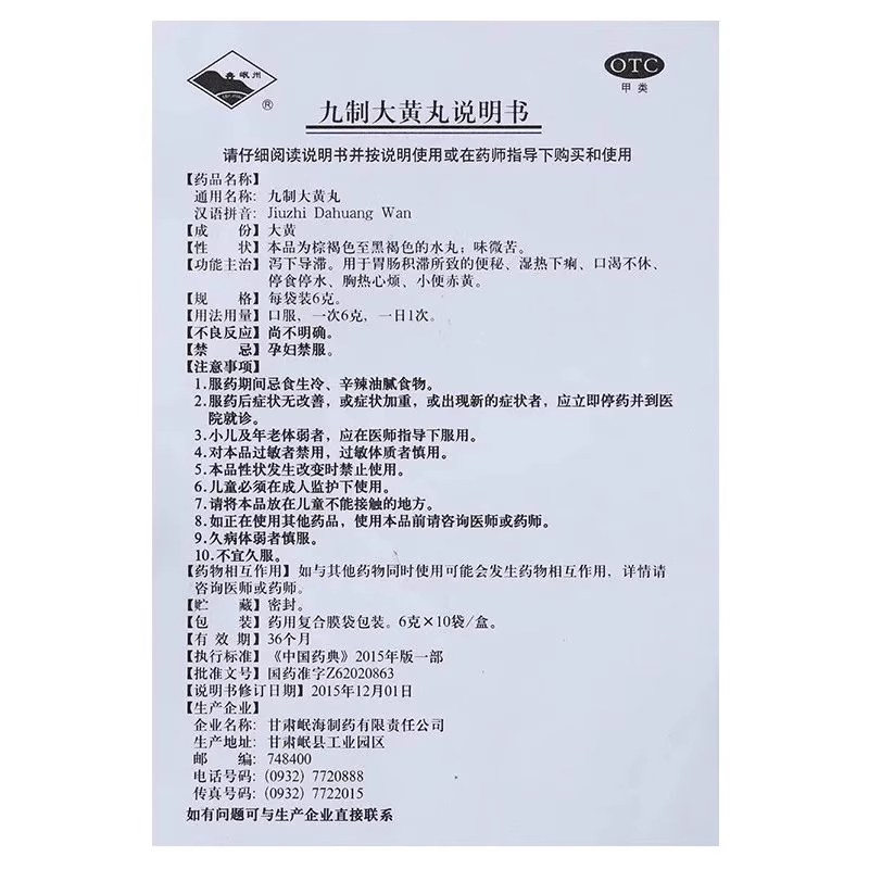 【岷州】九制大黄丸6g*10袋/盒湿热便秘