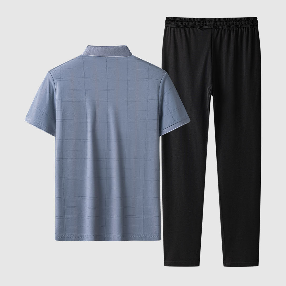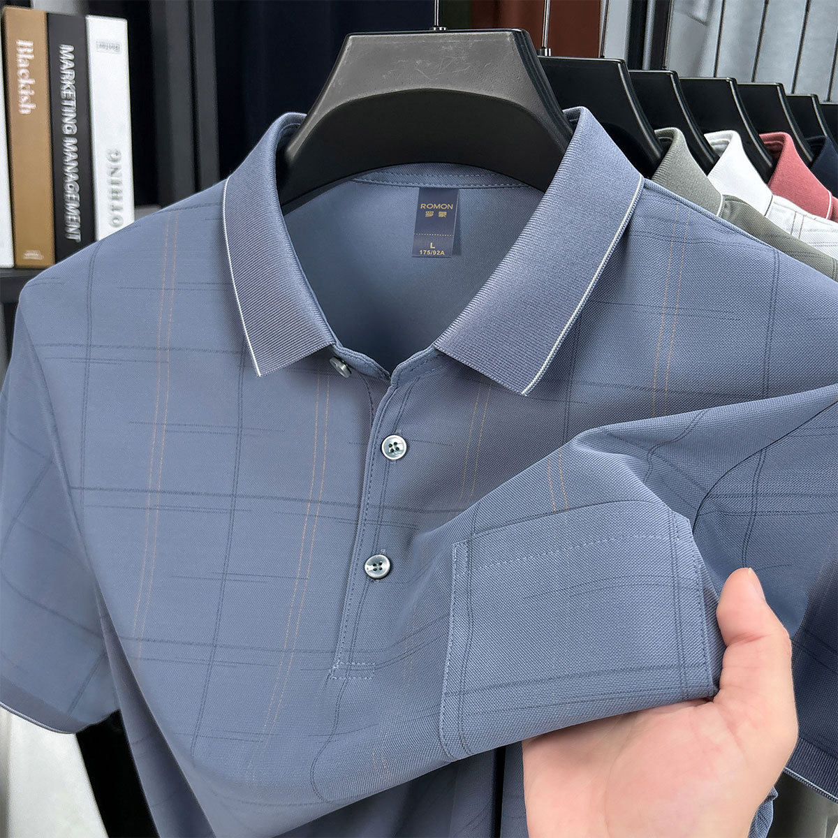 罗蒙男士冰丝套装夏格纹短袖POLO衫真口袋T恤运动休闲长裤两件套