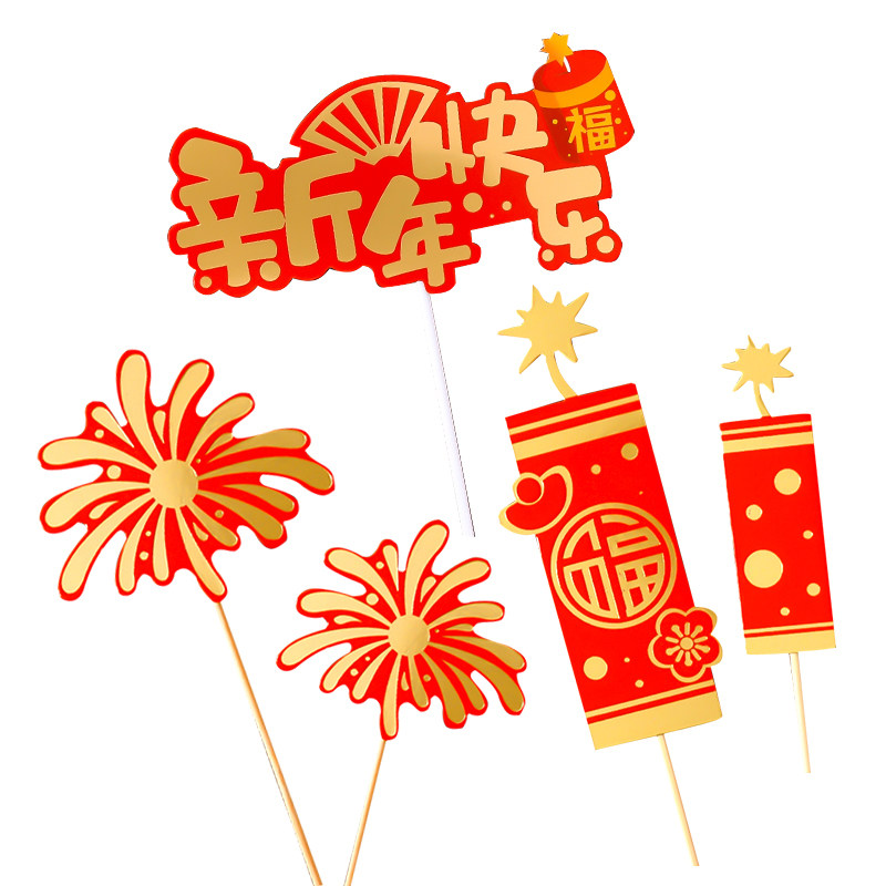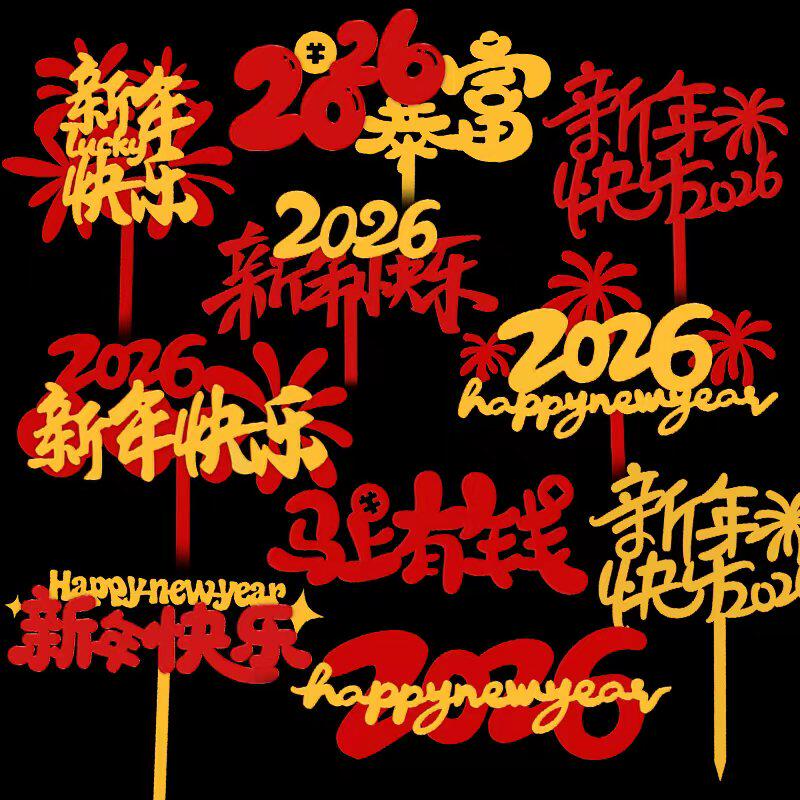新年快乐蛋糕装饰插牌马年2026跨年元旦春节烫金灯笼礼花爆竹插件