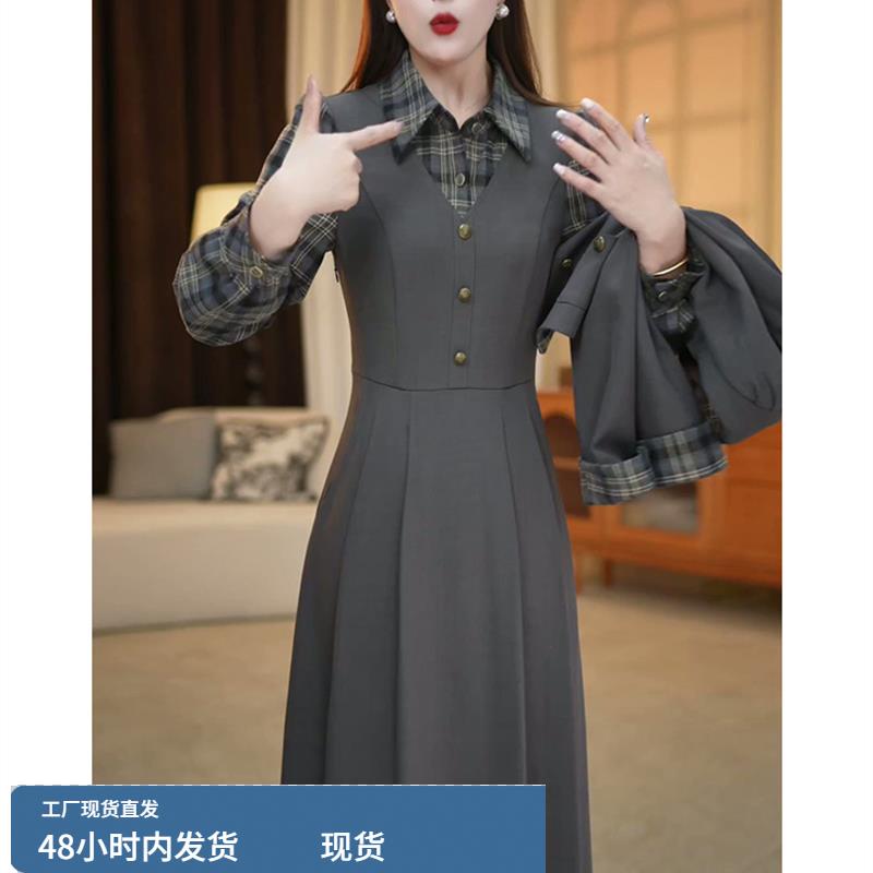 洋气长袖两件套连衣裙女2025春秋新款流行妈妈POLO领格子套装裙子