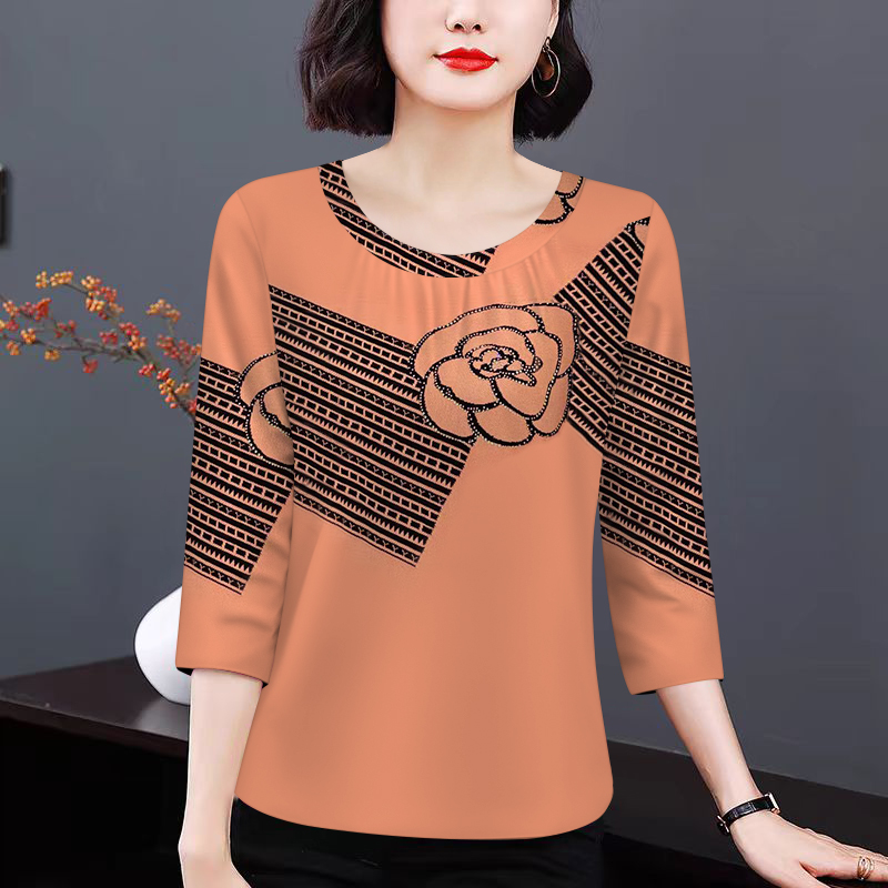 气质圆领打底衫女装秋季新款洋气印花褶皱七分袖t恤修身内搭上衣