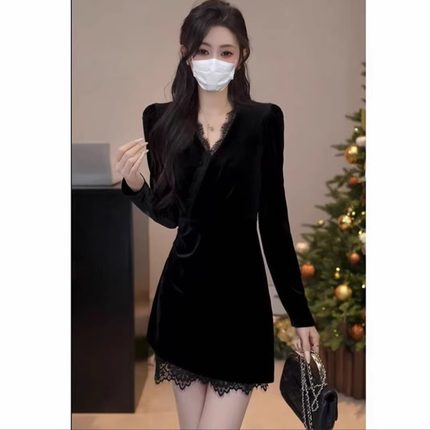 御姐风V领蕾丝拼接丝绒长袖连衣裙女黑色收腰修身显瘦气质短裙子