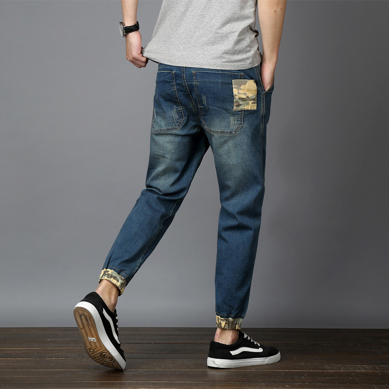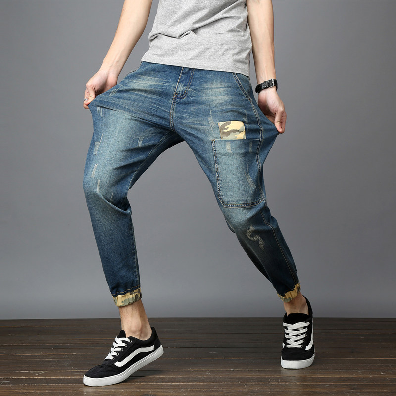 四季款哈伦裤宽松大码九分裤迷彩牛仔裤男9分潮秋季高弹力小脚裤