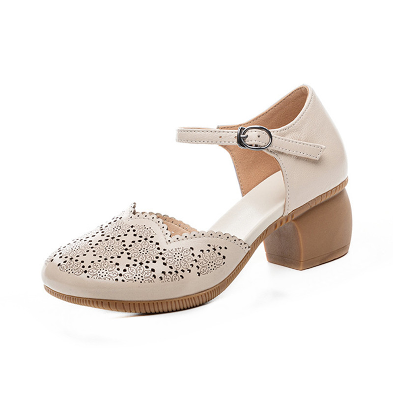 2025夏季新款真皮包头凉鞋女粗跟软底镂空透气一字带中空妈妈鞋