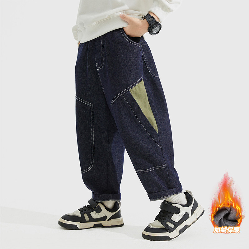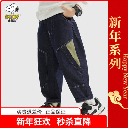 史努比童装男童加绒牛仔裤儿童一体绒秋冬长裤男孩女童冬装厚裤子