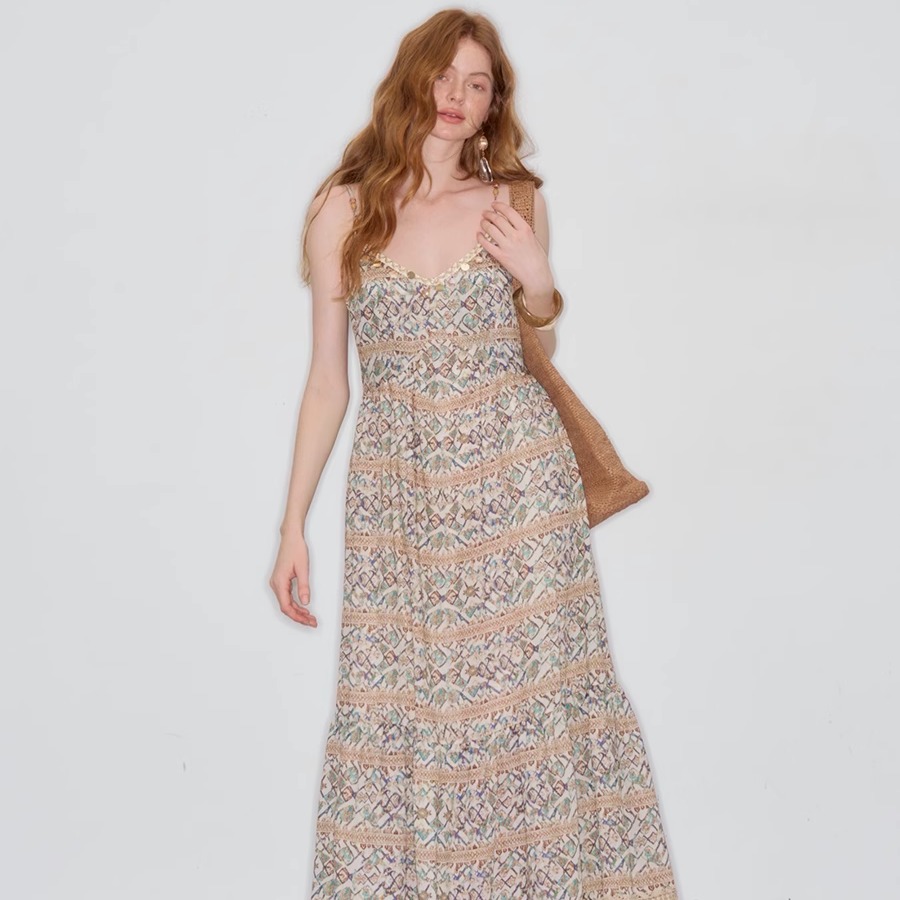 DeesseSicile 波西米亚度假风V领亮片蕾丝碎花串珠吊带裙连衣裙女