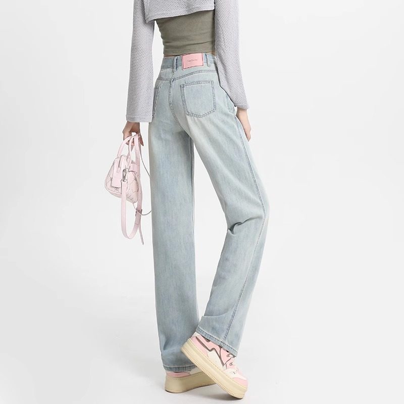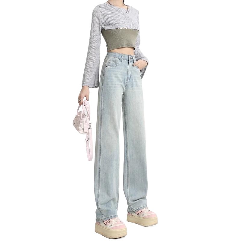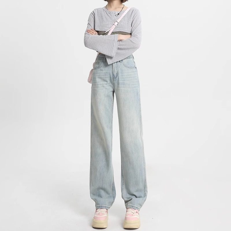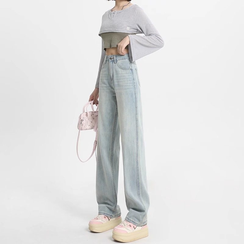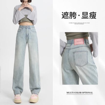 月光蓝宽松直筒牛仔裤女2025夏季薄款高腰bf慵懒风窄版拖地阔腿裤