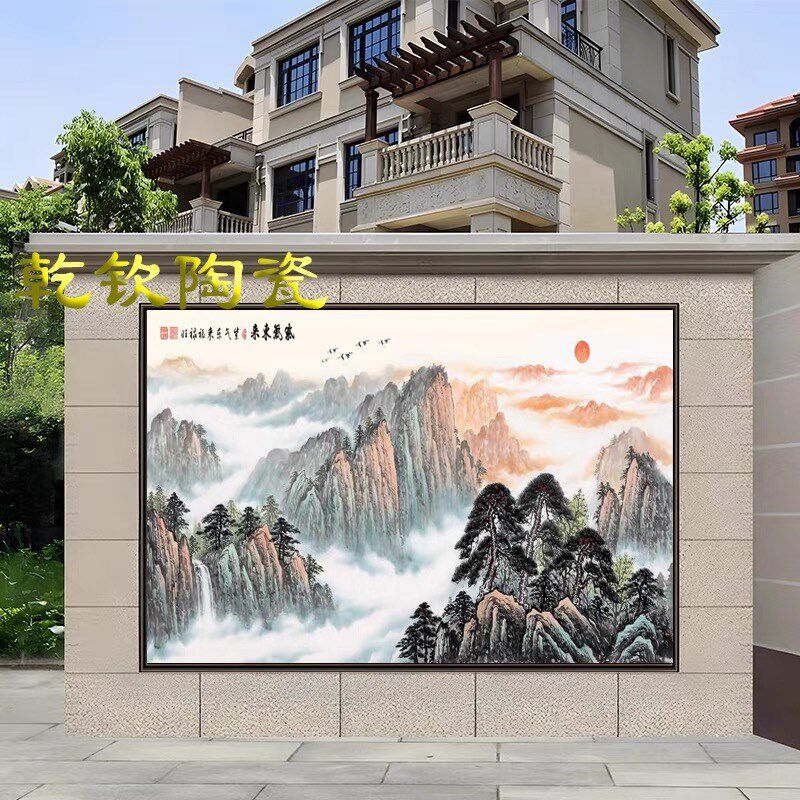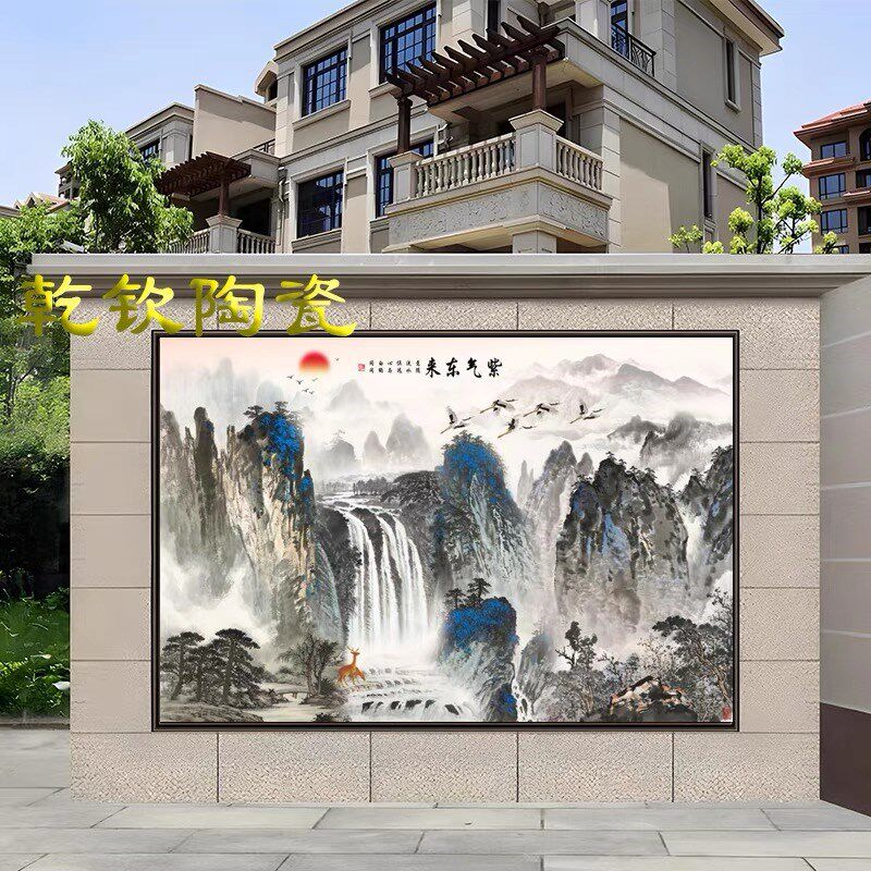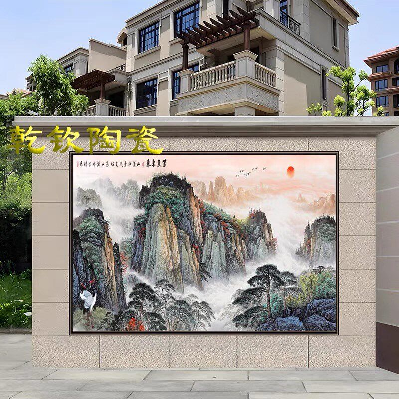 户外现代简约别墅迎门墙壁画客厅瓷砖背景墙新中式庭院照壁墙山
