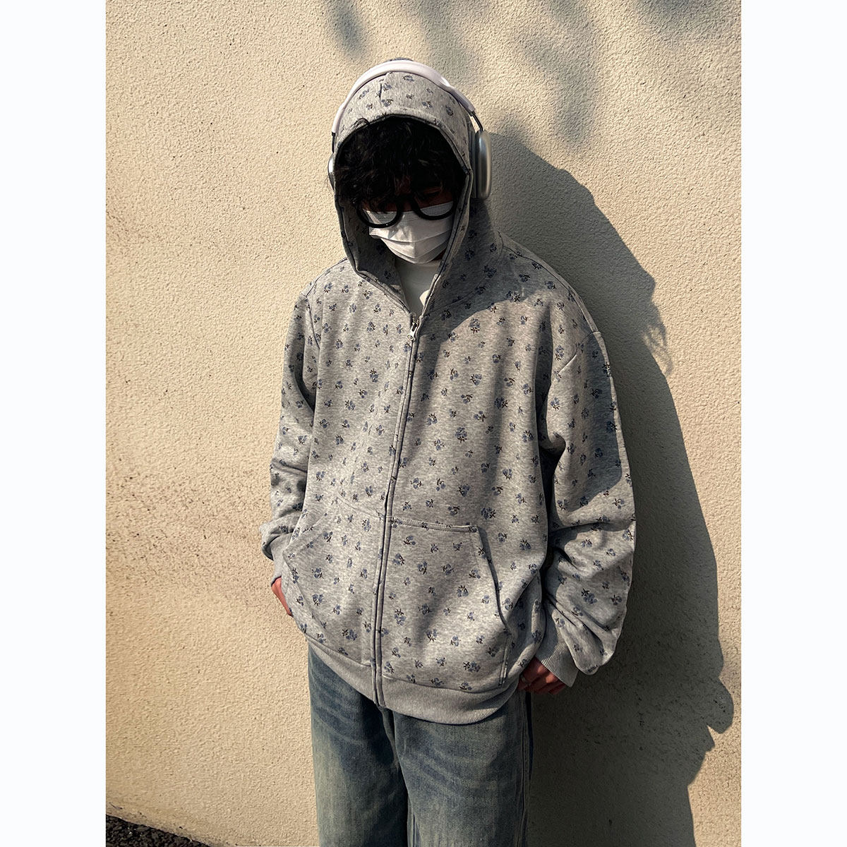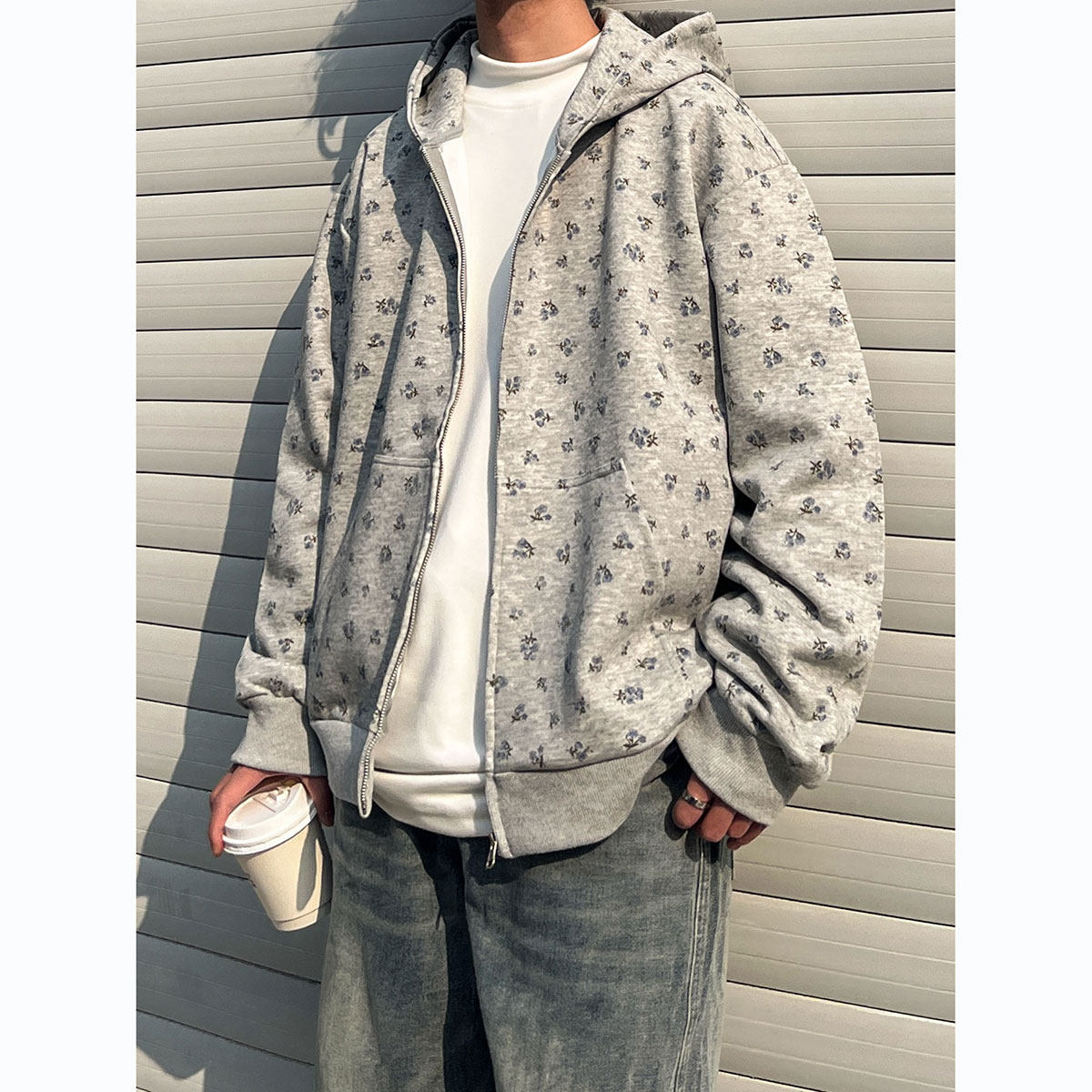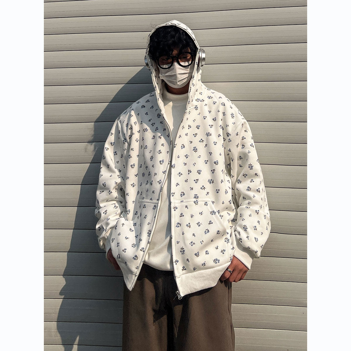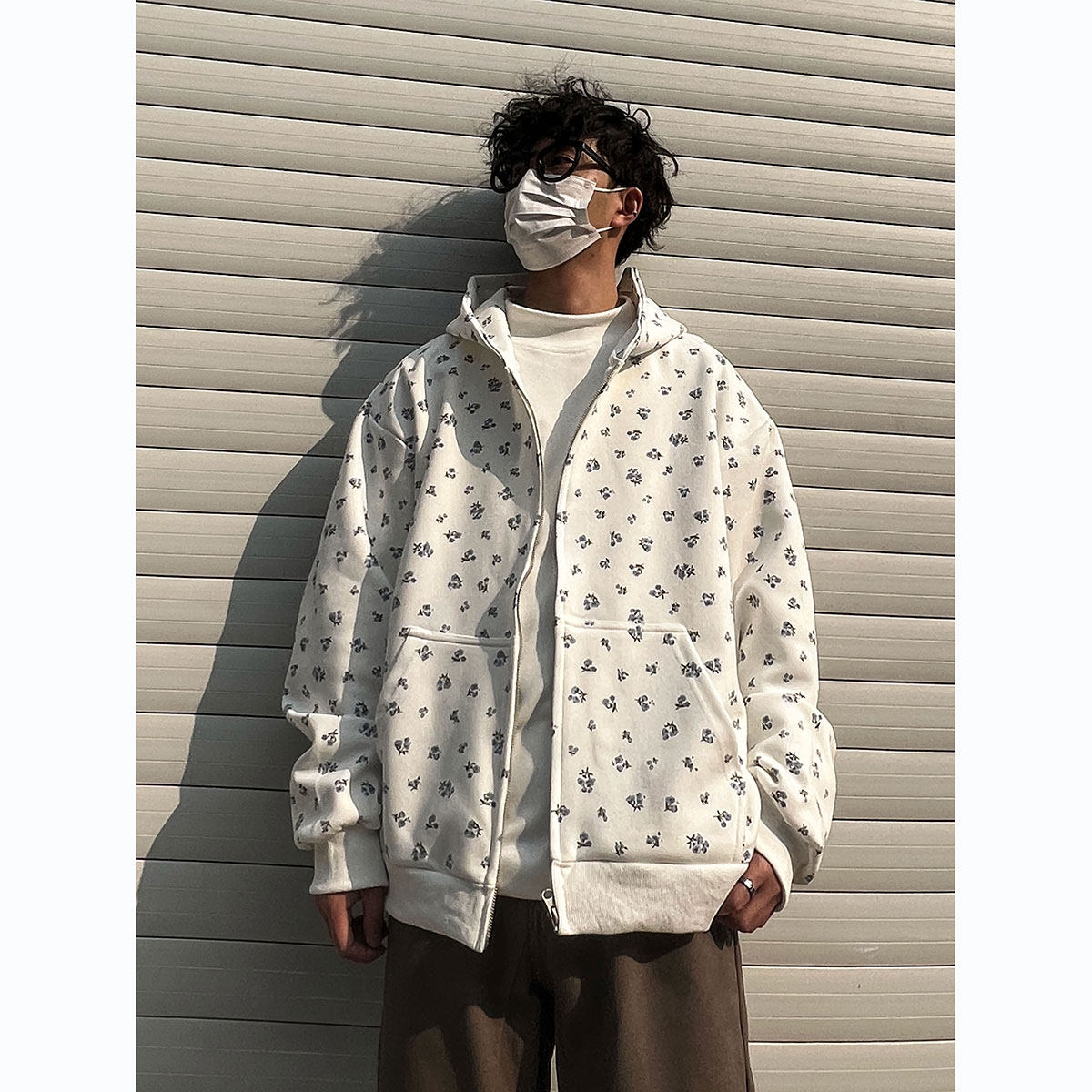 小碎花满印连帽卫衣男士冬季潮流情侣款学生时尚美式潮牌休闲外套