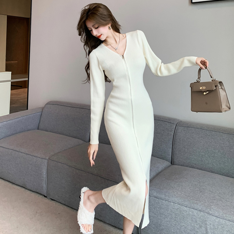 针织洋装女秋冬季V领气质双拉炼修身开叉长版配大衣打底裙过膝