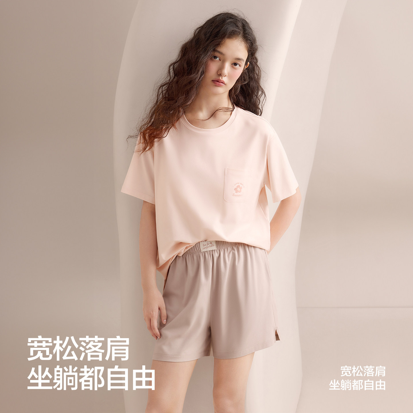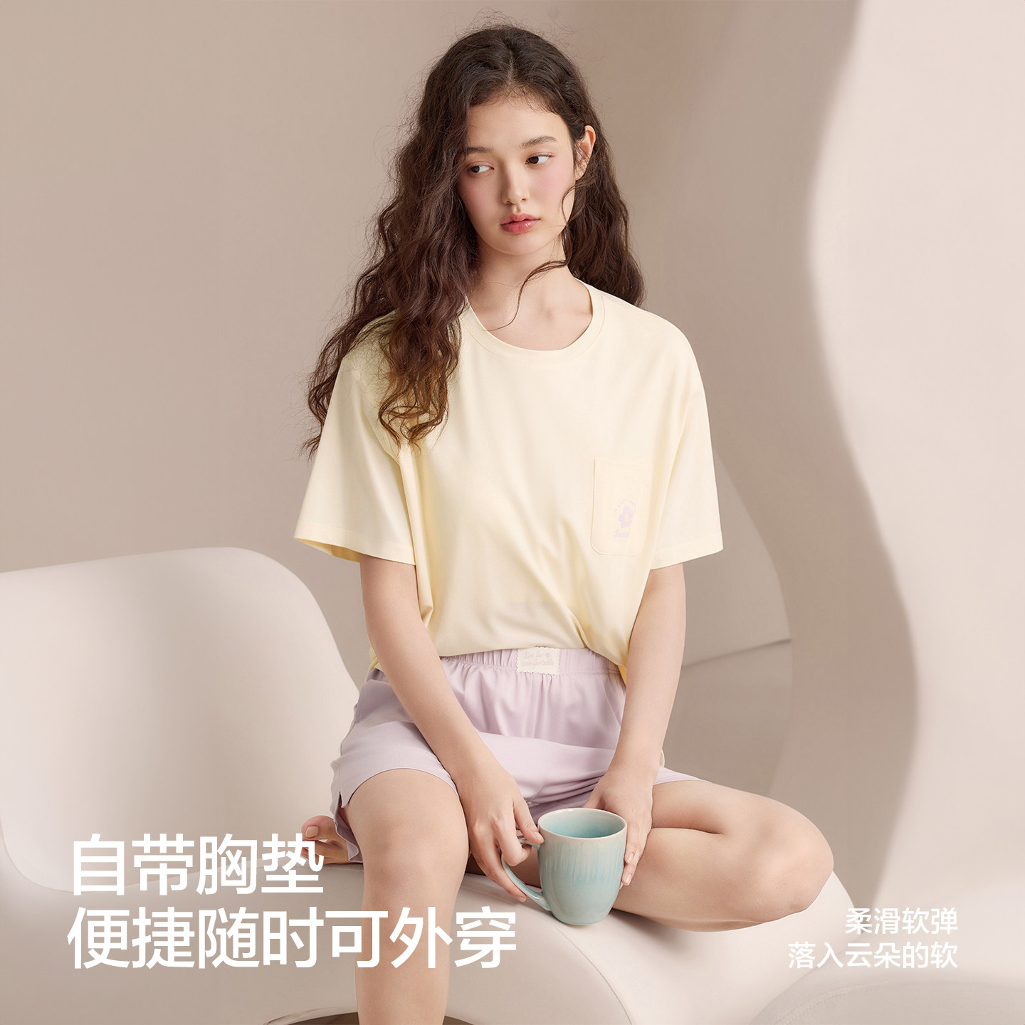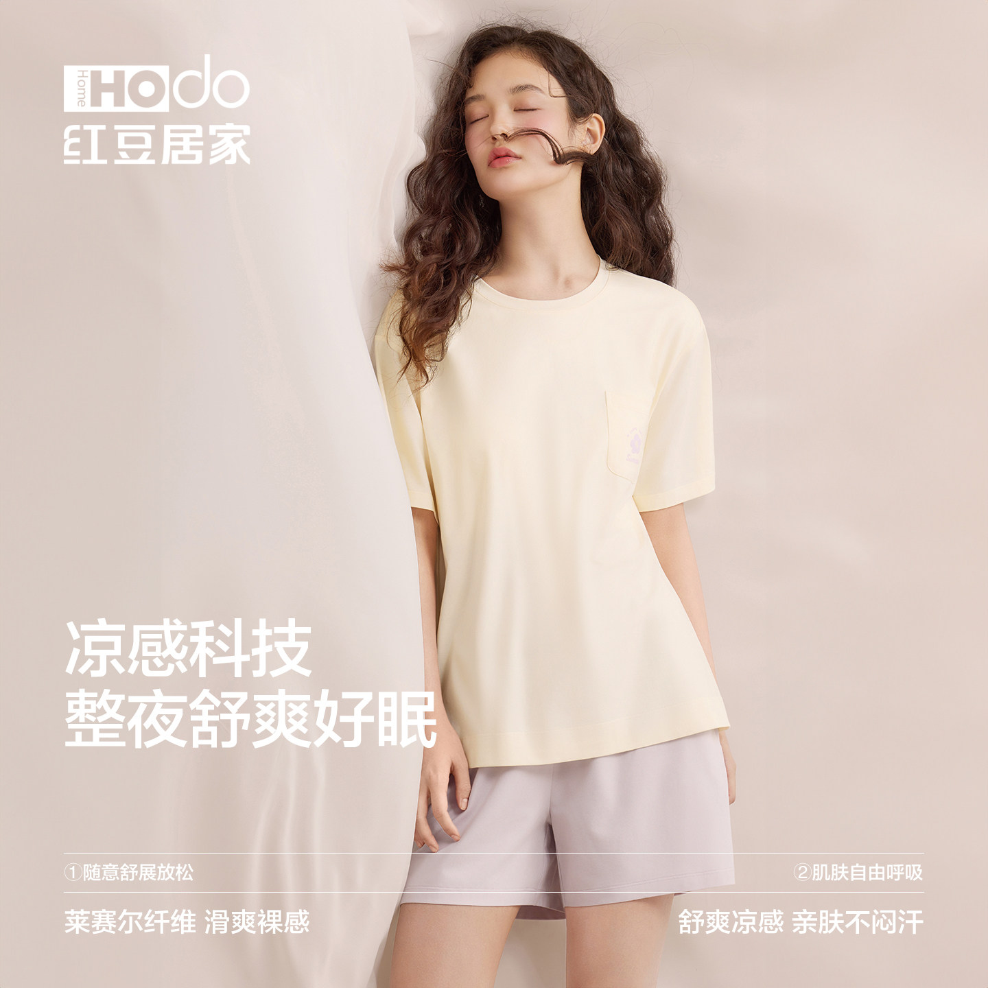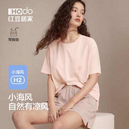 红豆【小海风】睡衣女带胸垫凉感冰丝莱赛尔短袖T恤家居服套装夏