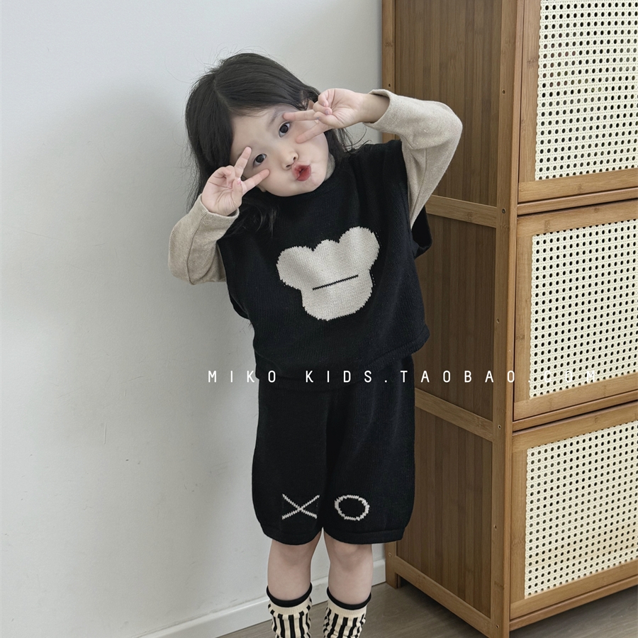 韩国童装女童卡通提花针织马甲套装2024秋冬宝宝背心短裤两件套