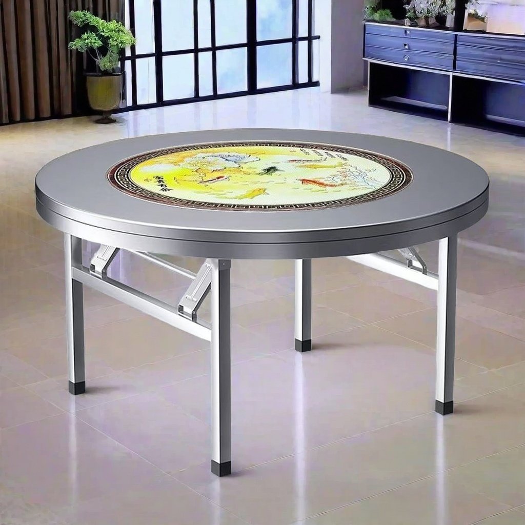 不锈钢转盘圆桌子内置彩图可折叠家用餐桌饭桌商用酒席圆台免安装